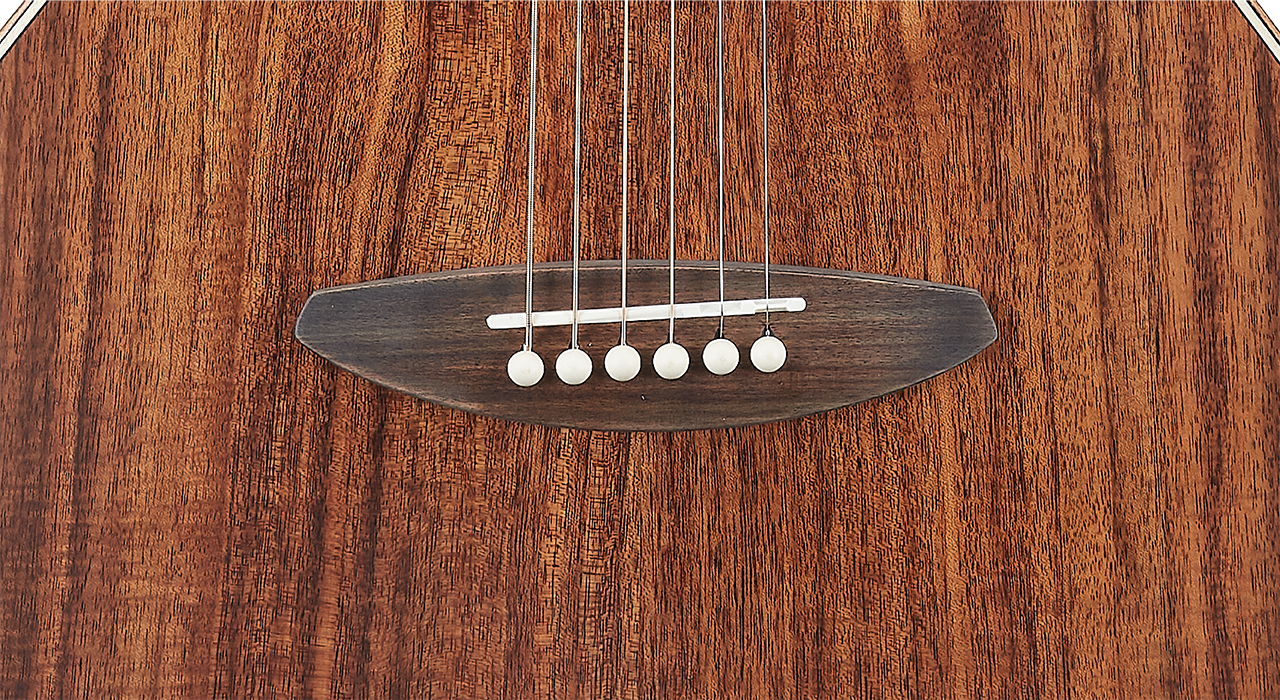 鳥吉他定製的微笑造型琴橋,使用硬度較高的玫瑰木,能支撐琴的後段琴弦張力。搭配合成
