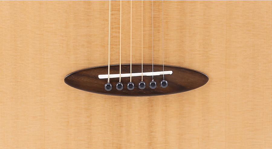 鳥吉他定製的橢圓造型琴橋,使用硬度較高的玫瑰木,能支撐琴的後段琴弦張力。搭配水牛骨弦枕,讓琴的延音有力,且擁有純淨的音色,質地堅硬清脆,能有效的傳導琴弦的共鳴。每一根弦都做了個別補償,讓琴能有更精准的音准。