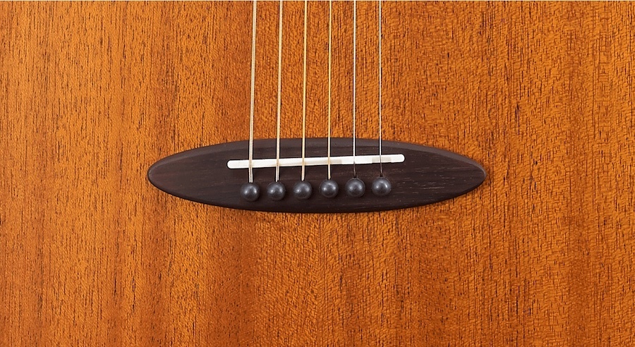 鳥吉他定製的橢圓造型琴橋,使用硬度較高的玫瑰木,能支撐琴的後段琴弦張力。搭配合成牛骨弦枕,質地堅硬清脆,能有效的傳導琴弦的共鳴。