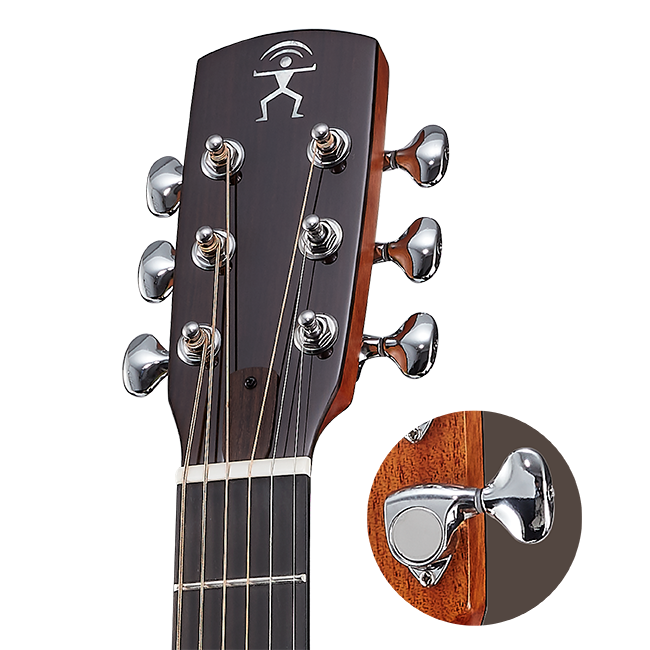 鳥吉他琴頭造型,玫瑰木琴頭貼片搭配白貝殼鑲嵌aNueNue LOGO。使用德榮1:14齒輪比的封閉式弦鈕,