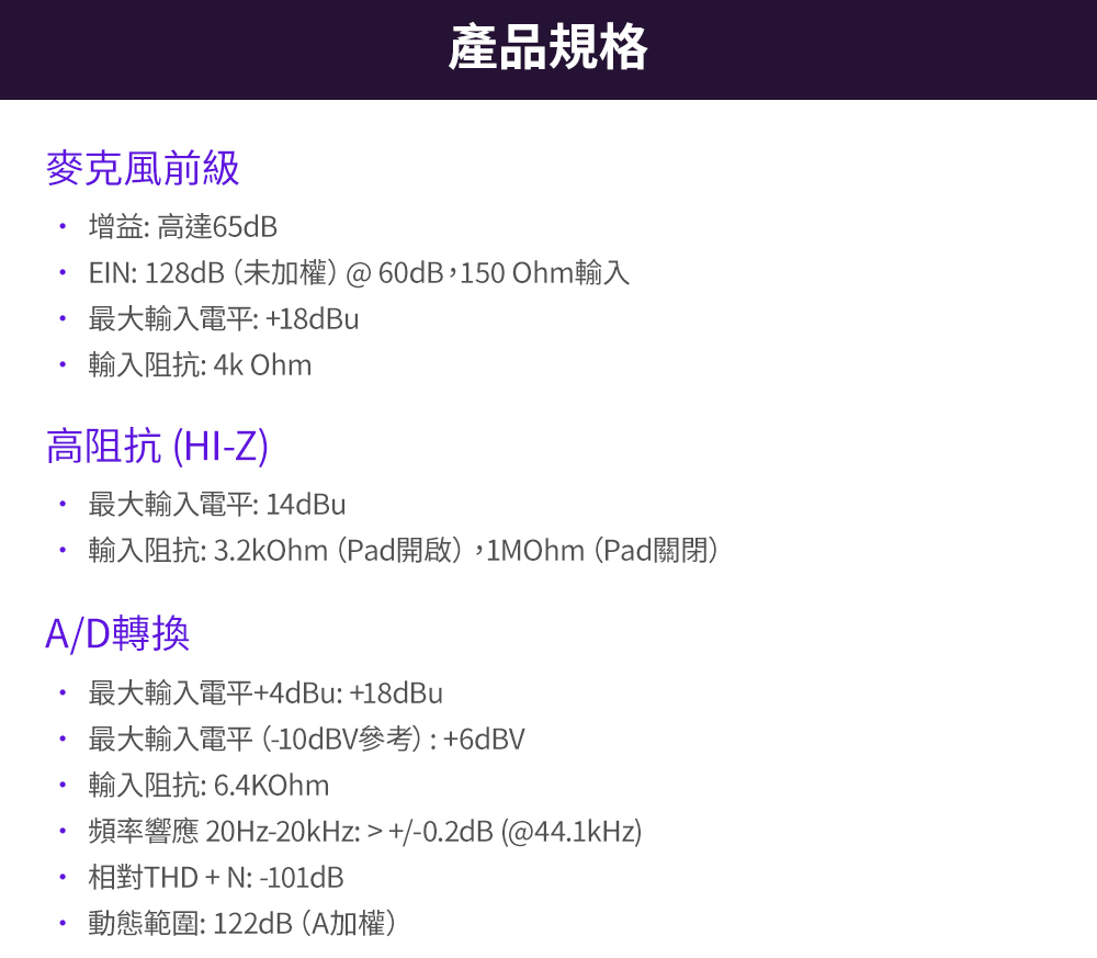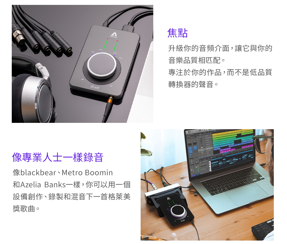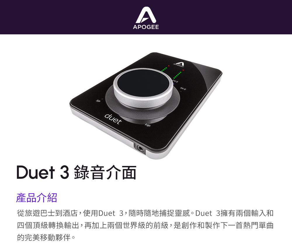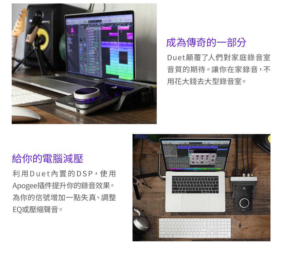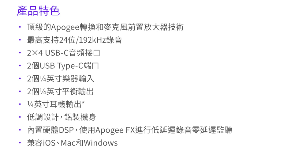 • 內置硬體DSP,使用Apogee FX進行低延遲錄音