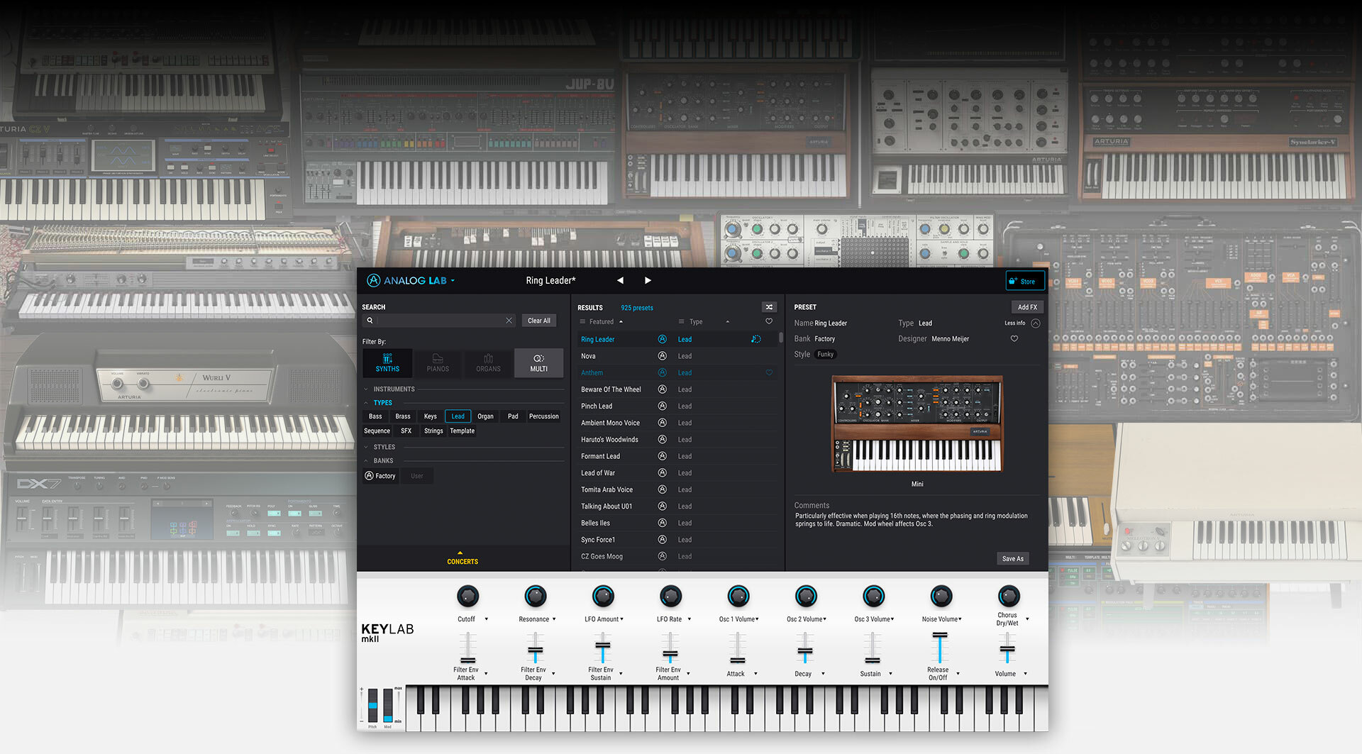 透過KeyLab Essential它可以幫助減少使用電腦鍵盤及滑鼠的時間,保持你的眼睛在演奏及音樂創作上,且與隨附的Abelton Live Lite及Arturia的Analog Lab 5軟體中的數千種聲音的完美整合,將立即成為你的創作核心。