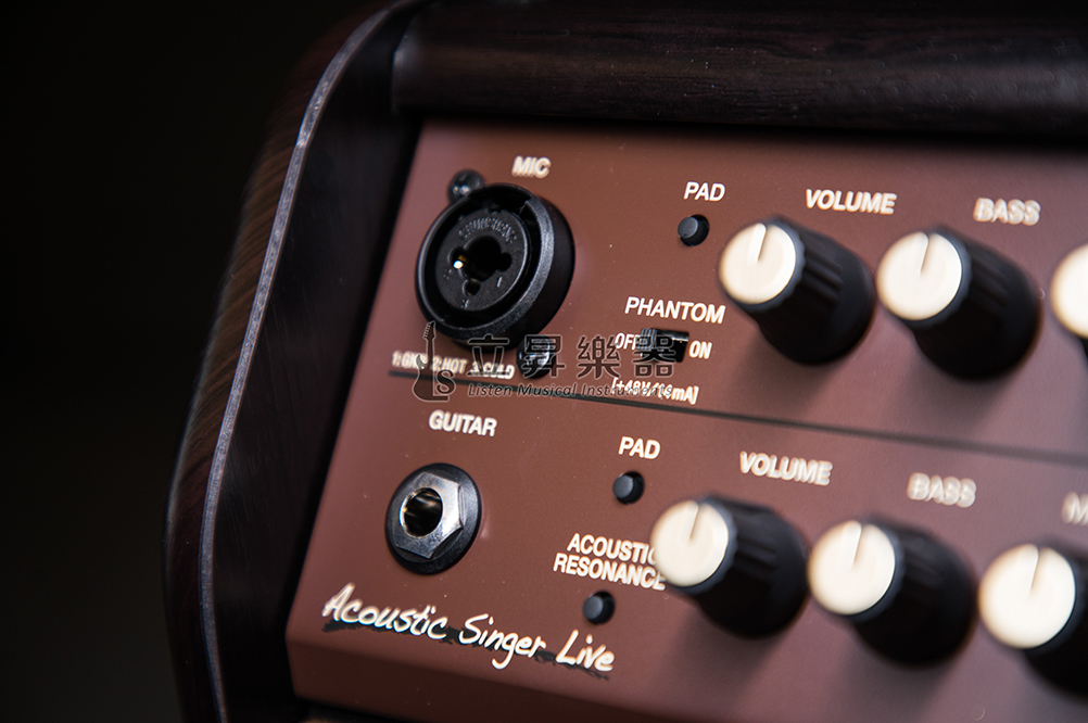 Acoustic Singer Live也有麥克風專屬頻道,為彈唱吉他手輕鬆架設小型、all-in-one的擴大系統方案。分離式類比輸入電路傳達飽滿、乾淨的聲音,提供phantom power讓您能夠連接使用錄音室級的電容式麥克風。這個頻道也提供三段EQ,phase開關與防止迴授的notch控制,還有高品質的delay/echo與殘響效果,讓您的聲音更豐富動聽。如果您的Acoustic Singer Live僅連接吉他,可以利用這個頻道為您的傳統樂器做麥克風收音。對於在更進階設置使用時,它也能夠完美搭配其它裝置在吉他上的擴音來源,例如第二個拾音器或是內建喇叭。