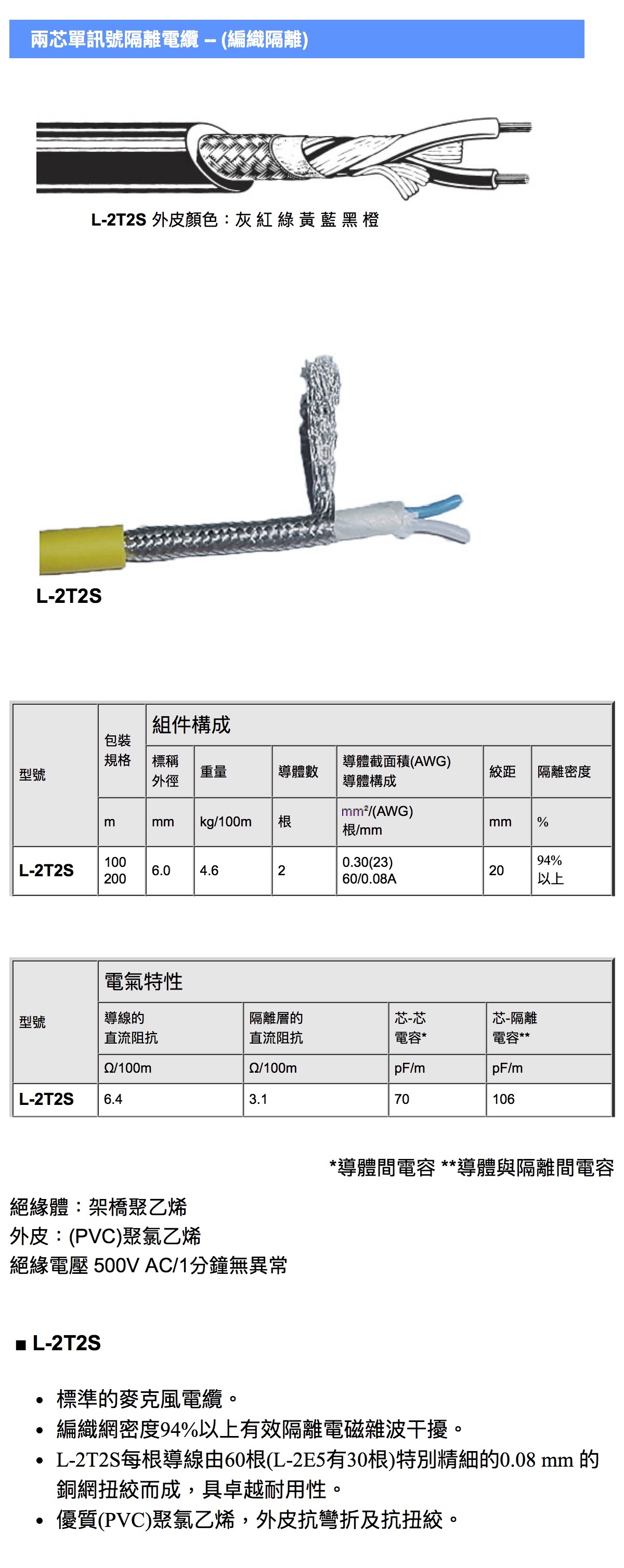 ➤ L-2T2S 外徑6mm、60根精細的0.08 mm 的銅網扭絞而成,隔離密度94%以上