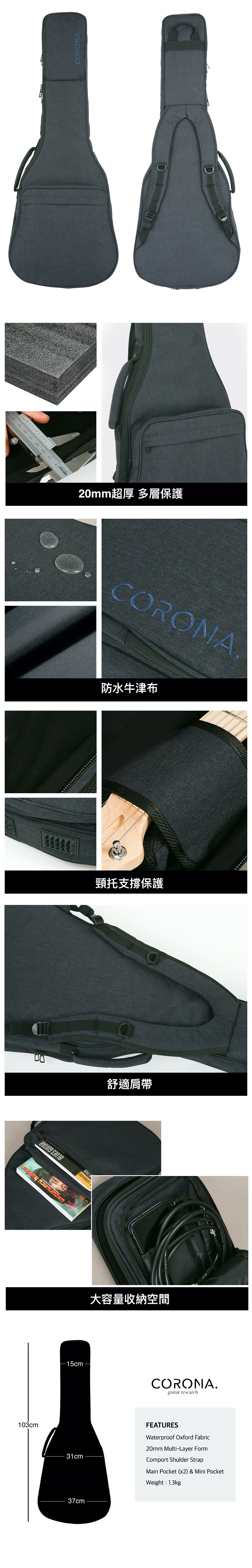 Corona 琴袋,設計時尚。防水牛津布製成,因此具有很強的抗污染性和防水性。充足的儲物空間、20 毫米的壓縮襯墊、保護樂器安全的頸托和舒適的肩帶,Corona才有高優質性價比。