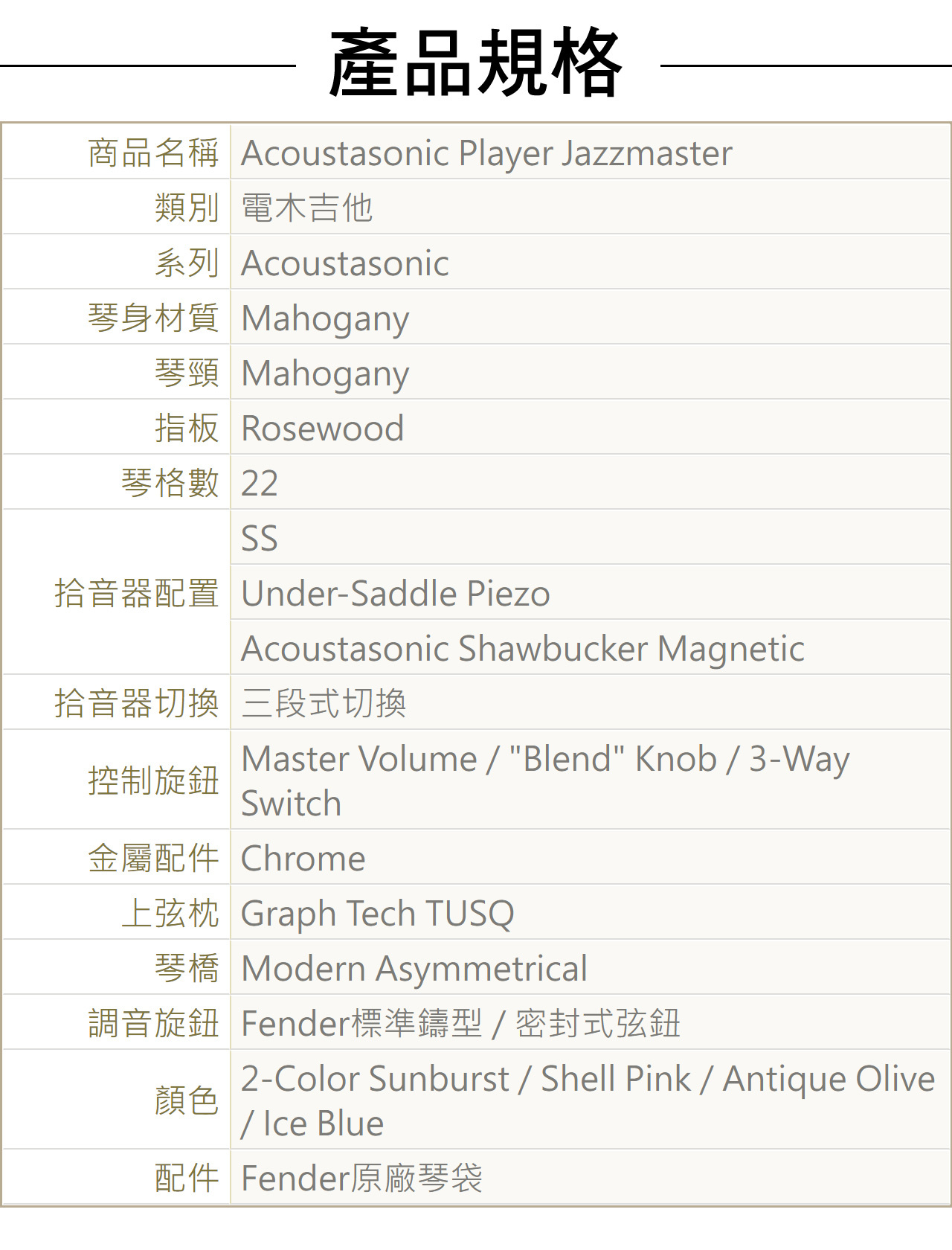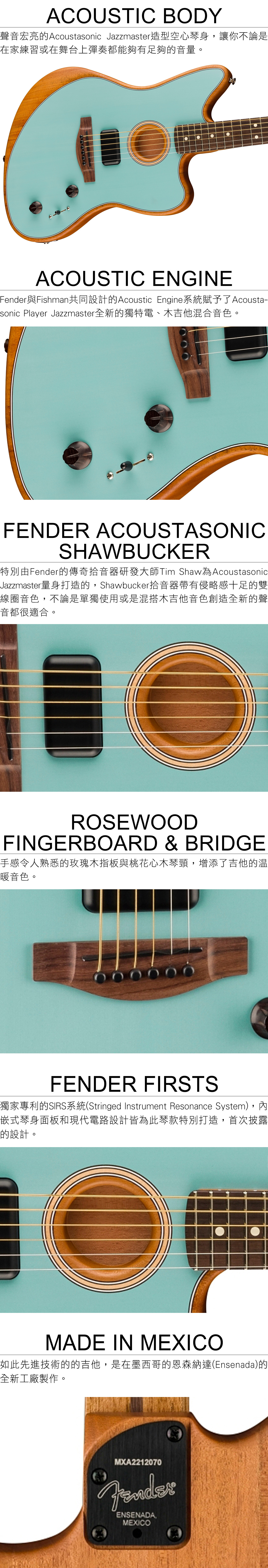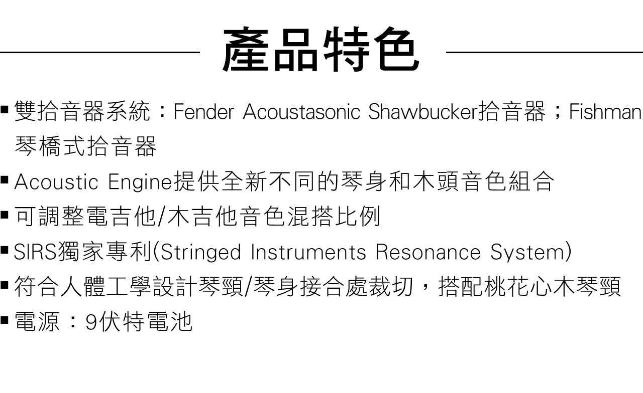 ● 雙拾音器系統:Fender Acoustasonic Shawbucker拾音器;Fishman琴橋式拾音器