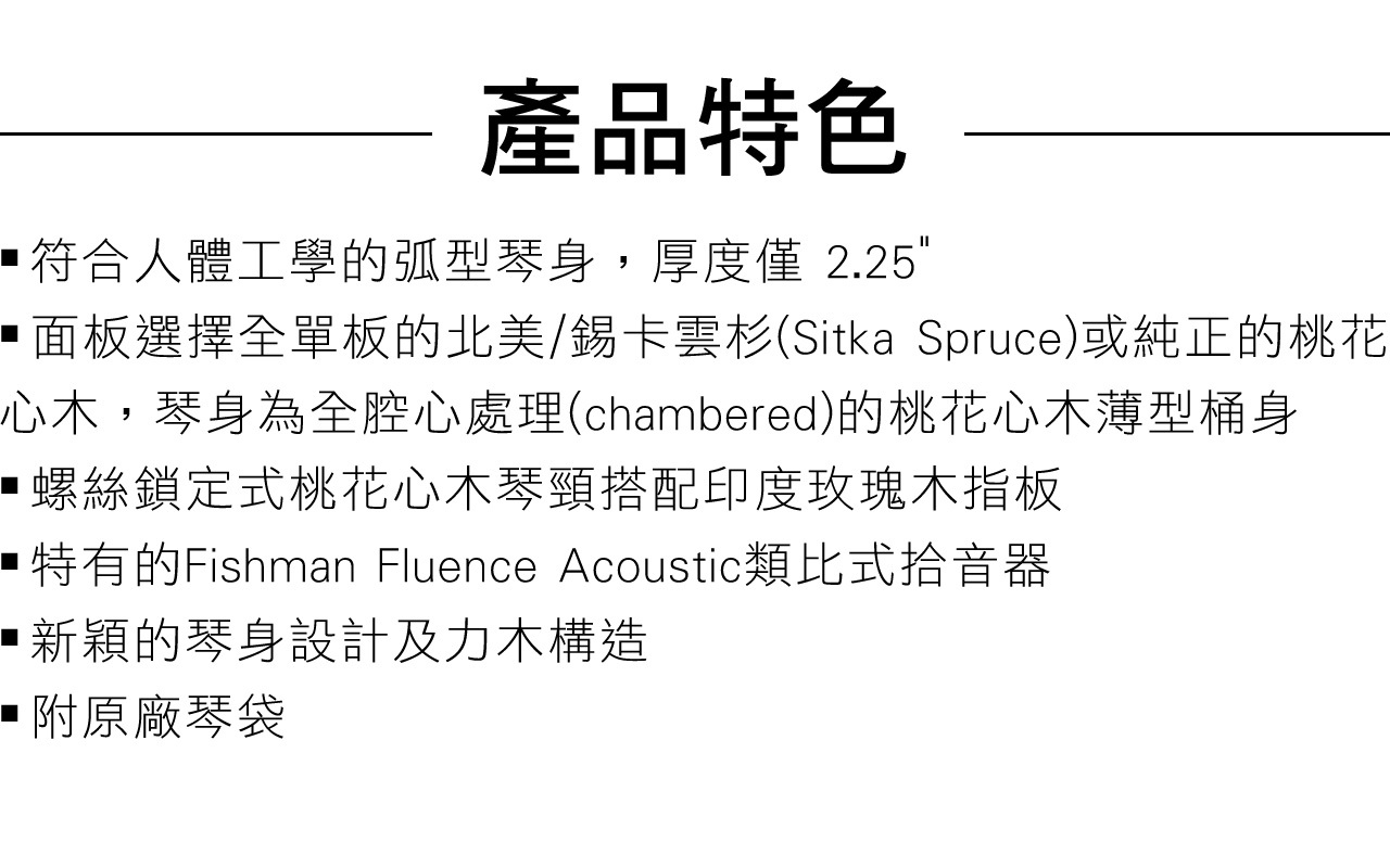 ● 專有的Fishman Fluence Acoustic拾音器系統
