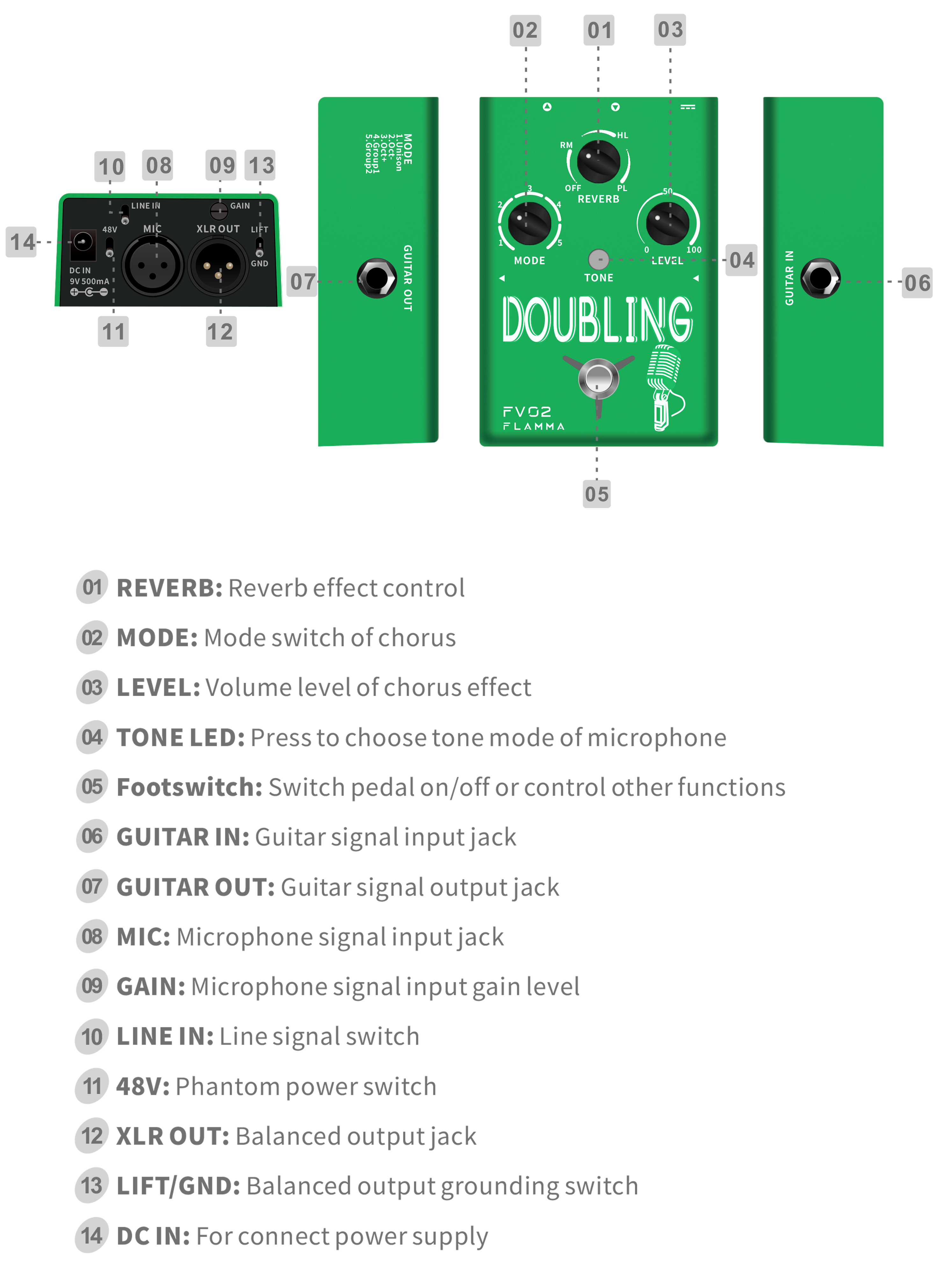 • FV02提供三種經典混響效果,旋鈕在分段範圍內分別調節對應的混響音量