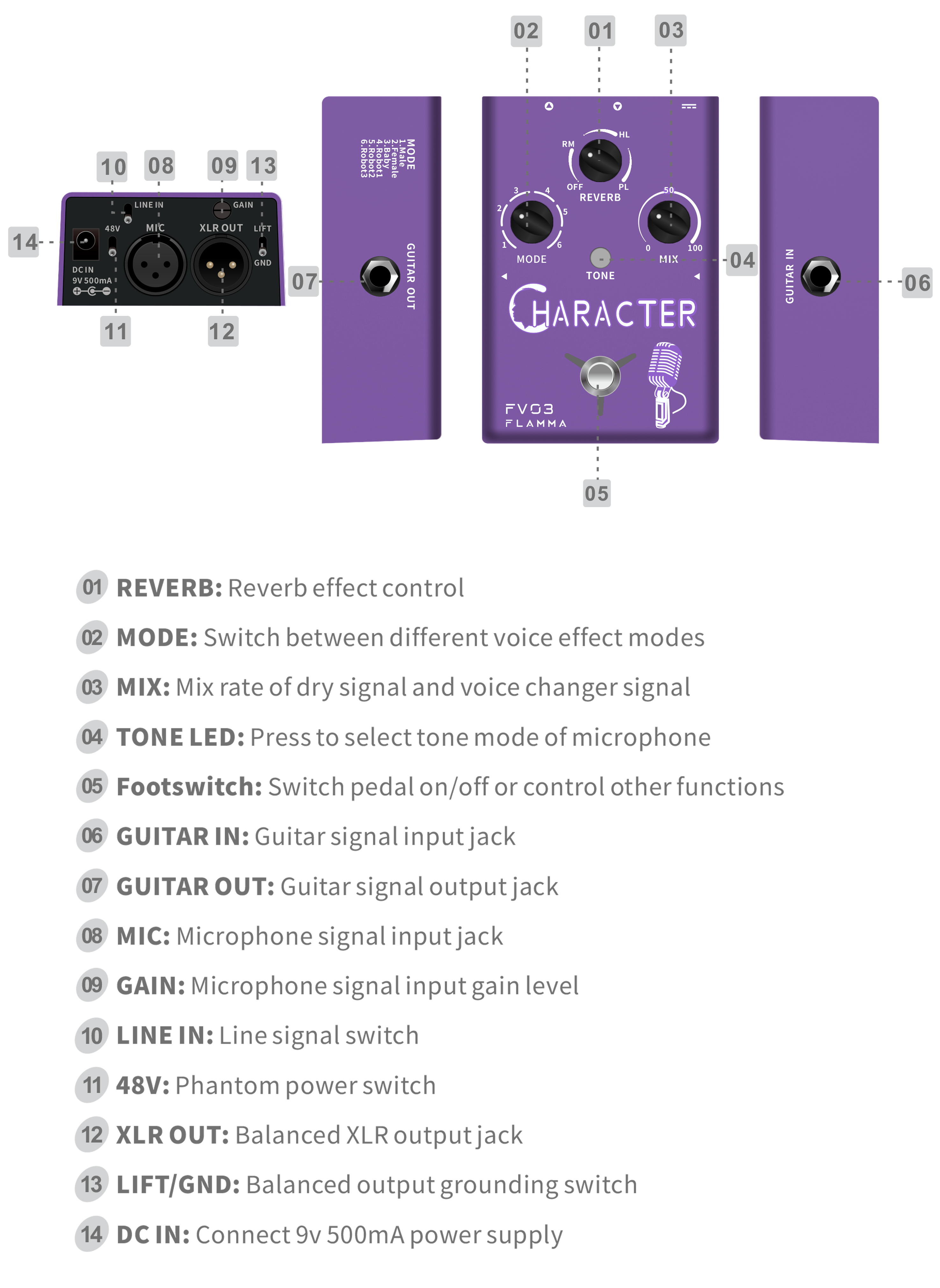面板描述長按踩釘的同時上電,Tone按鍵燈與踩釘燈紅色閃爍後熄滅提示模式切換成功。混合輸出模式下,吉他通 道信號與MIC通道信號混合後可通過GUITAR OUT和XLR OUT同時輸出