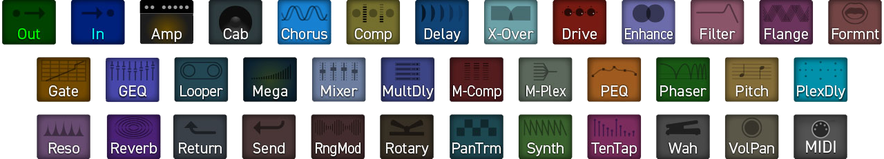 選集包括 57 多個驅動踏板模型、數十種延遲、眾多合唱、包圍、移相器、顫音和其他調製效果、50 多種混響類型(從經典彈簧到真實空間及其他)、多個壓縮器、wahs、EQ 和濾波器、2 個分鐘循環器,一整套音調效果,包括失諧、和聲和虛擬變調夾,以及旋轉、合成器、「複合」效果(包括閃光)等等。