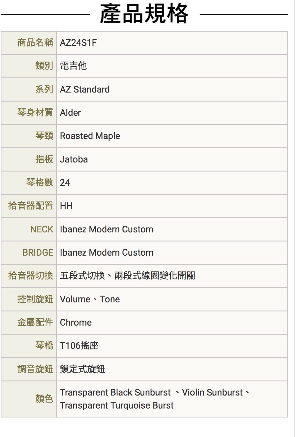 ● TKS : Transparent Black Sunburst、VLS : Violin Sunburst、TXB : Transparent Turquoise Burst
