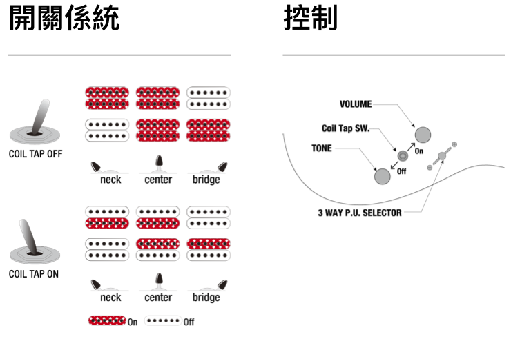 控制:1 x主音量、1 x音調、3段拾音器開關、單雙切換系統