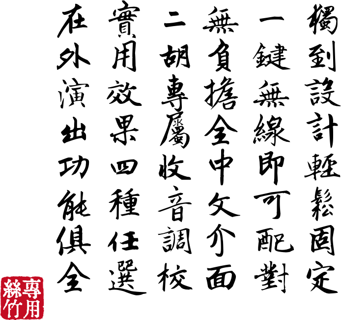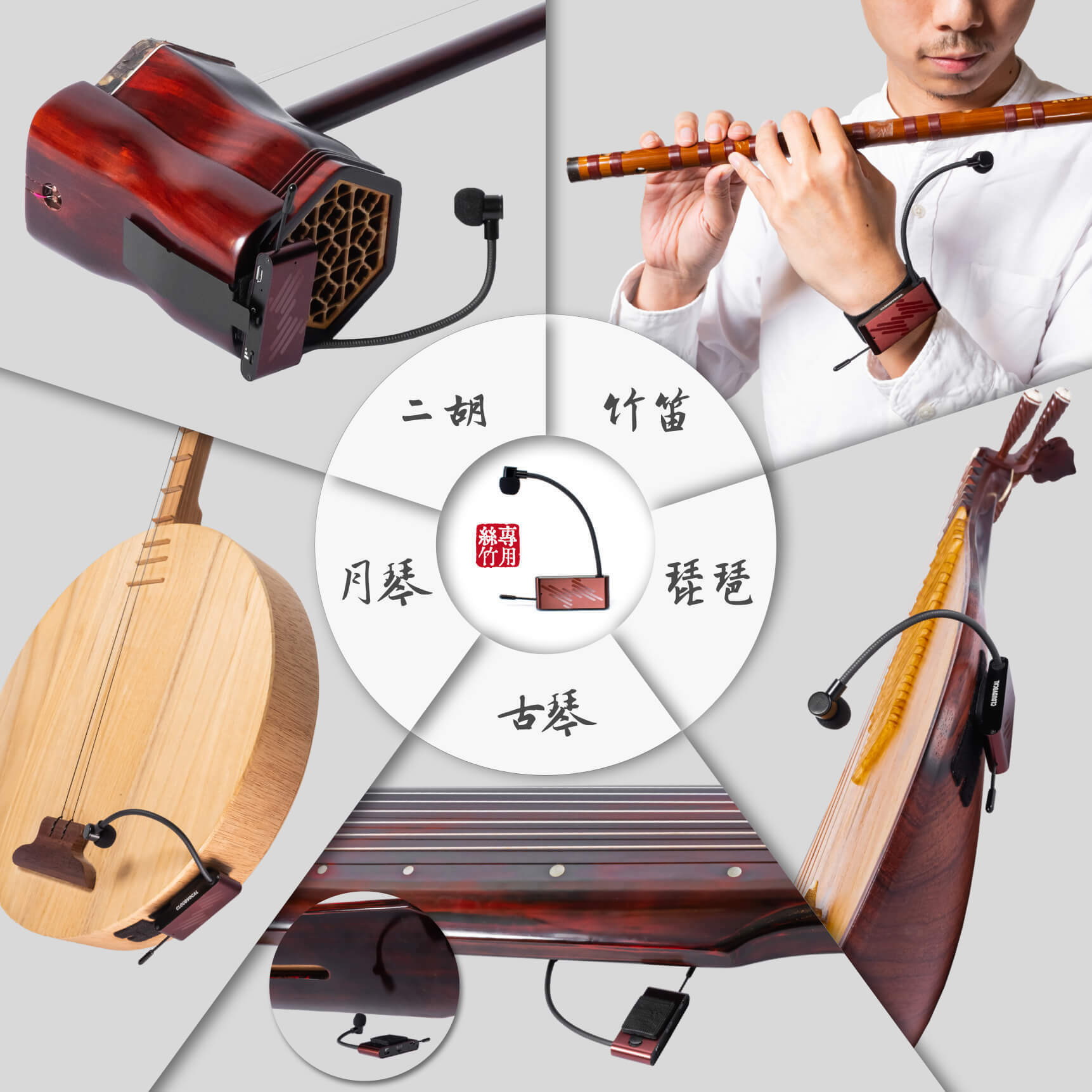 集結專業二胡與各類民族樂器老師們的演奏體驗,設計出優雅簡便的固定座,簡易、準確地安裝在收音