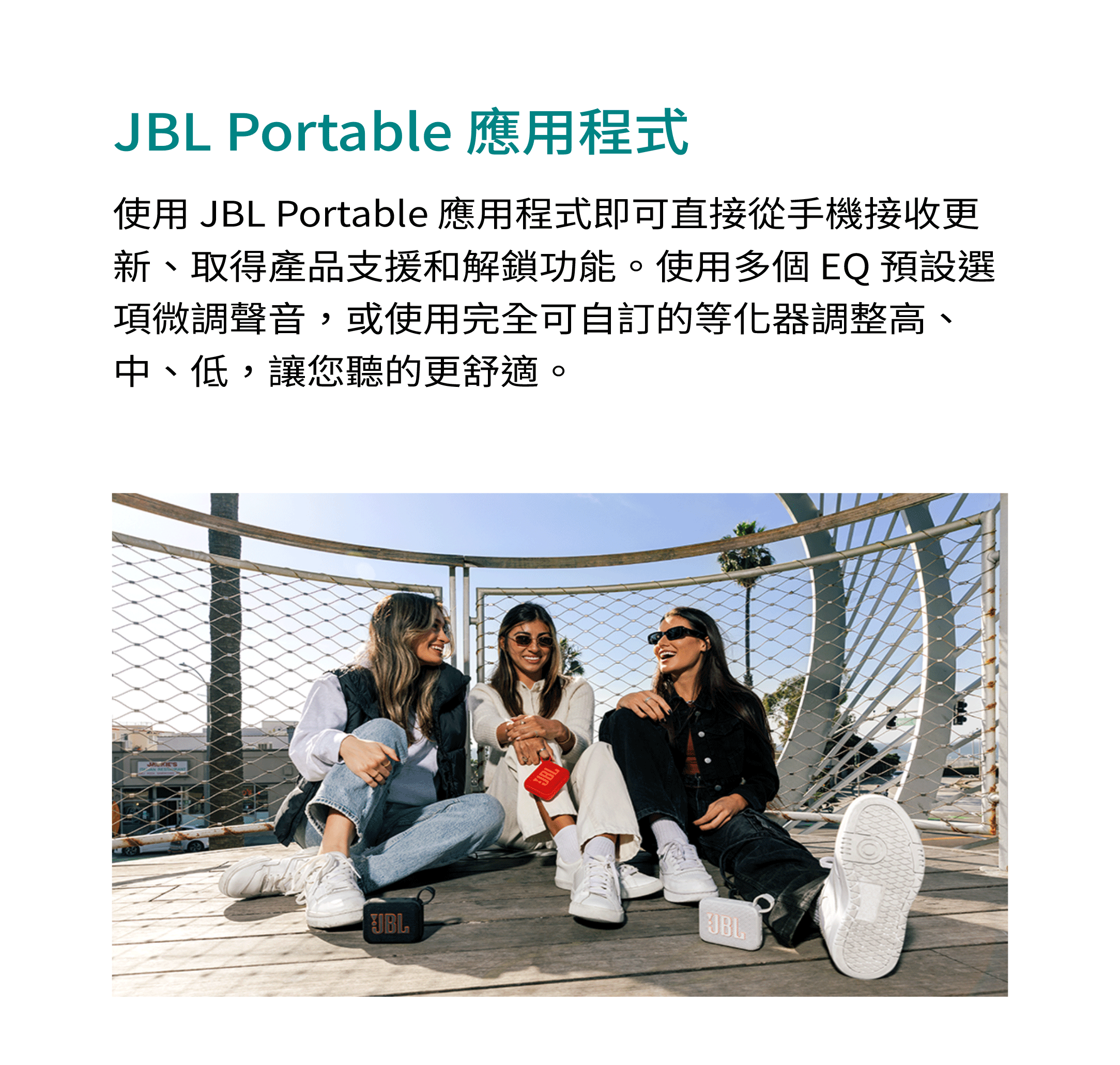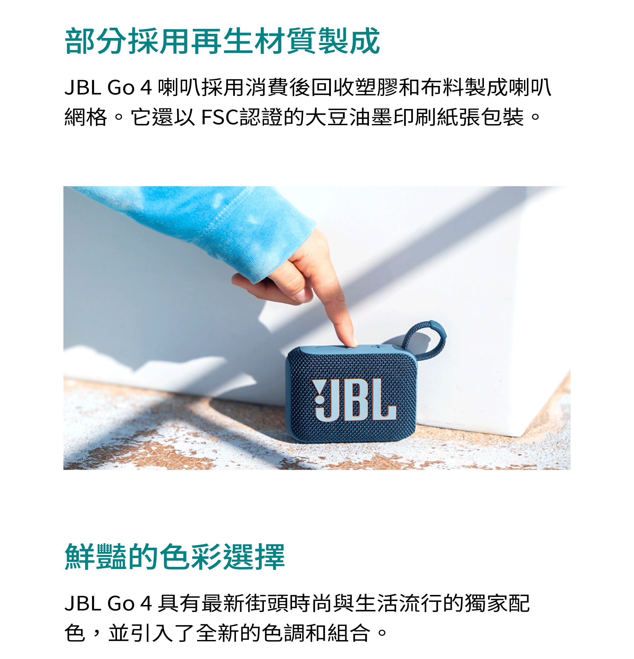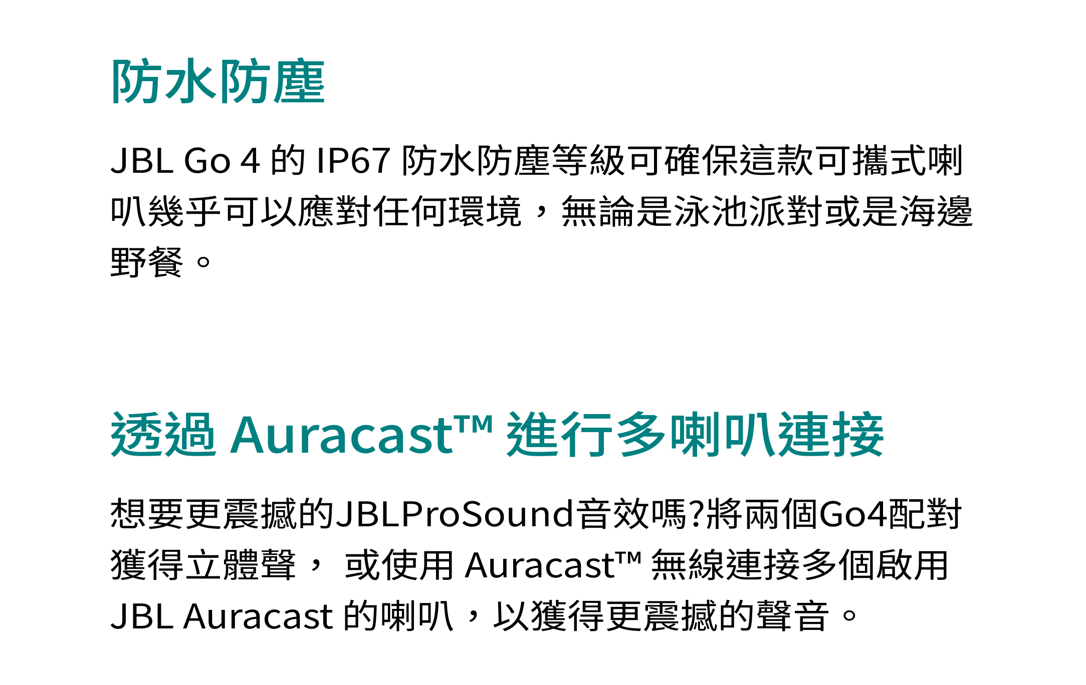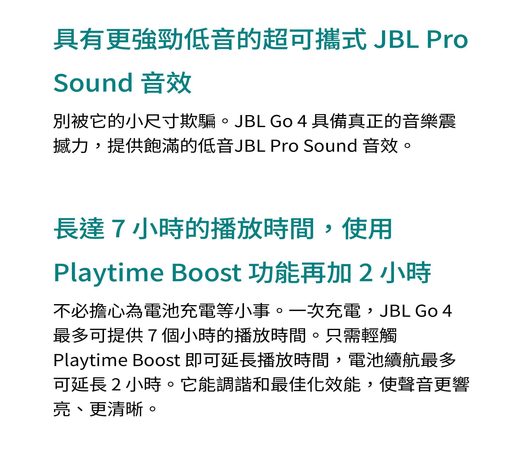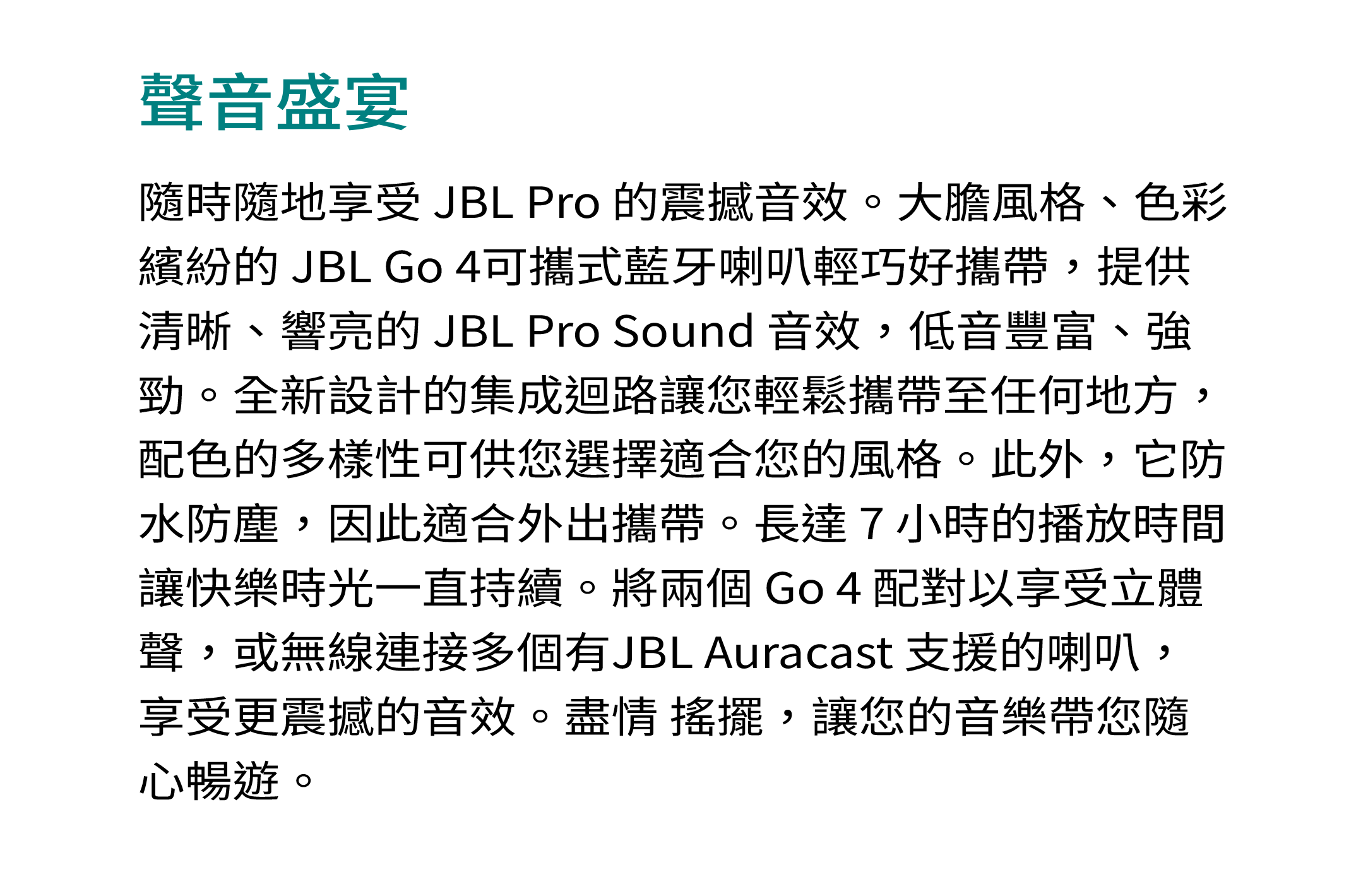 聲音盛宴 / 具有更強勁低音的超可攜式 JBL Pro Sound 音效 / 長達 7 小時的播放時間,使用 Playtime Boost 功能再加 2 小時 / 防水防塵 / 透過 AuracastTM 進行多喇叭連接 / 部分採用再生材質製成 / 鮮豔的色彩選擇 / JBL Portable 應用程式