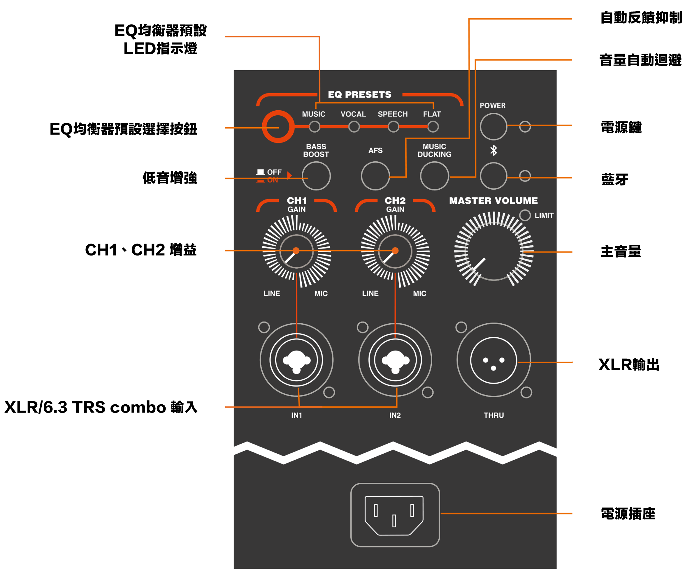 2 Combo Jack輸入、1 XLR(Thru) 輸出