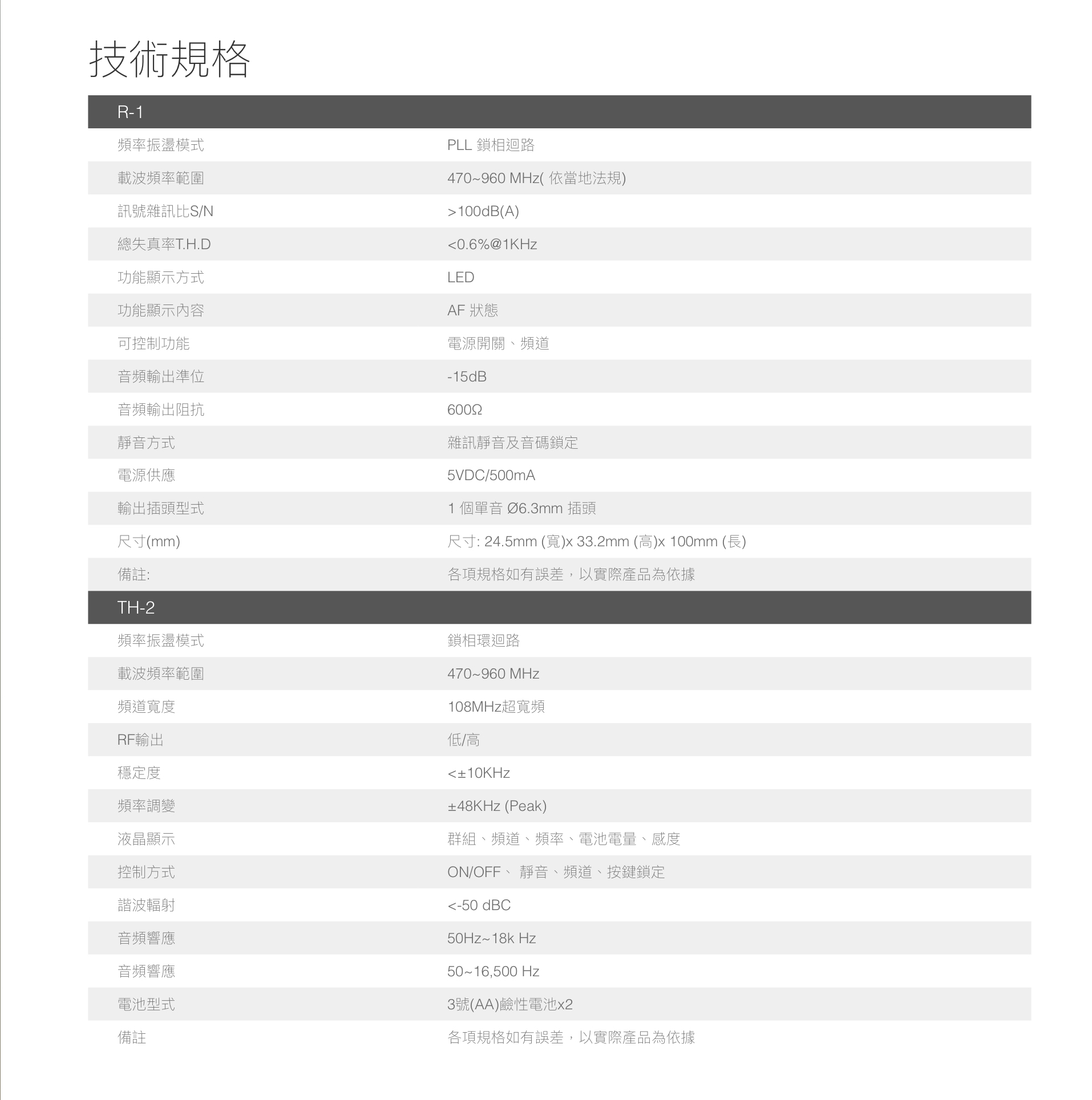 全新設計R-1小型無線接收機搭配6.3mm音源線, 提供使用者優越的音質與革命性的消費體驗 ! 輕巧可隨身攜帶以及高性價比等優點將有效取代傳統大型接收機, 成為家用麥克風、小型發表會、活動場合等的最佳選擇.