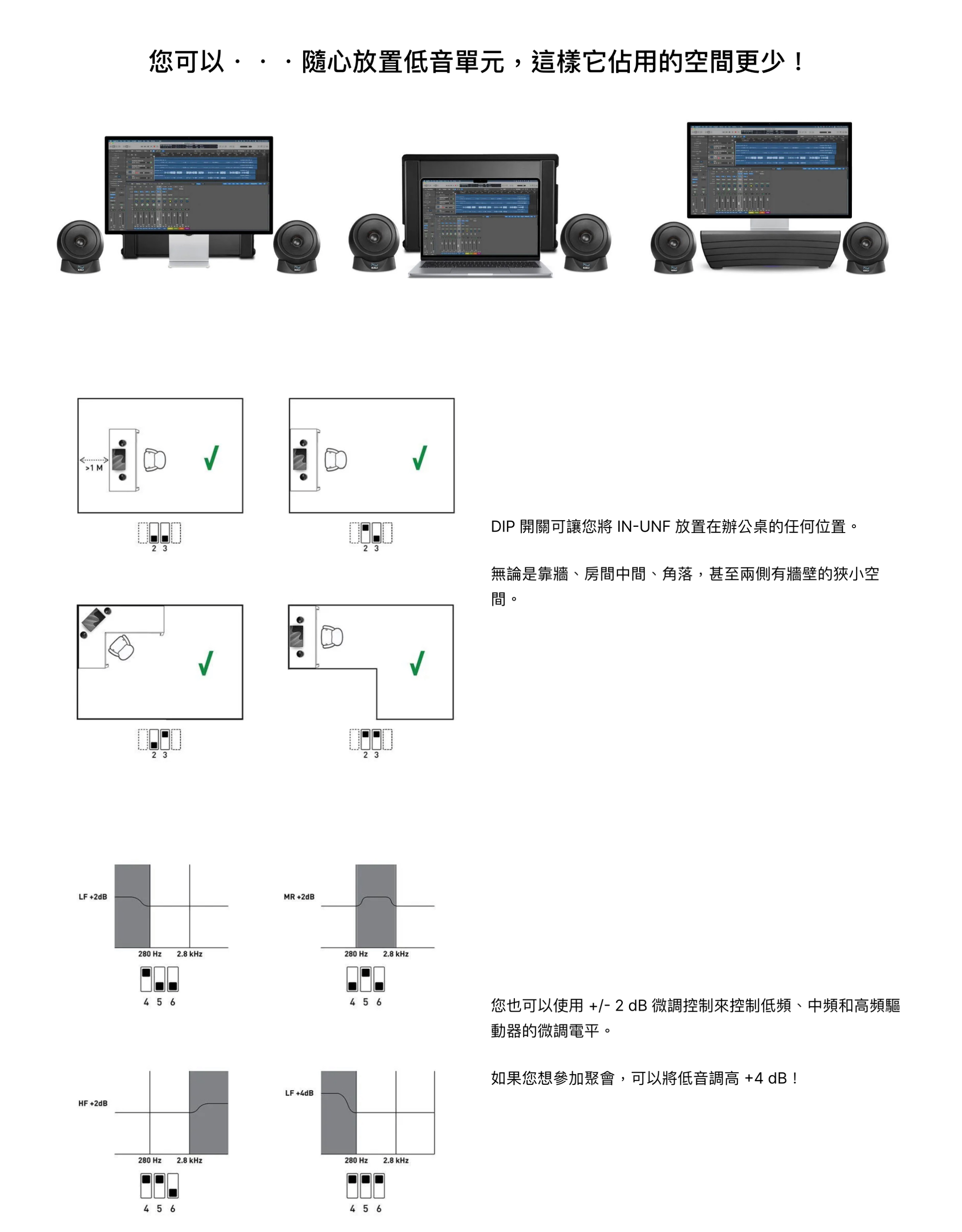 IN-UNF 專門設計用於放置在您的辦公桌上,並且您的辦公桌作為系統的聲學部件納入其中。從驅動器到桌面再到您耳朵的反射都會被考慮在內,為您提供完美清晰的混音圖像,您可以依靠它來很好地翻譯。