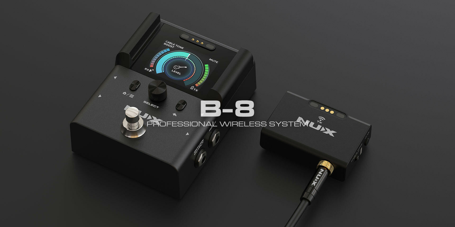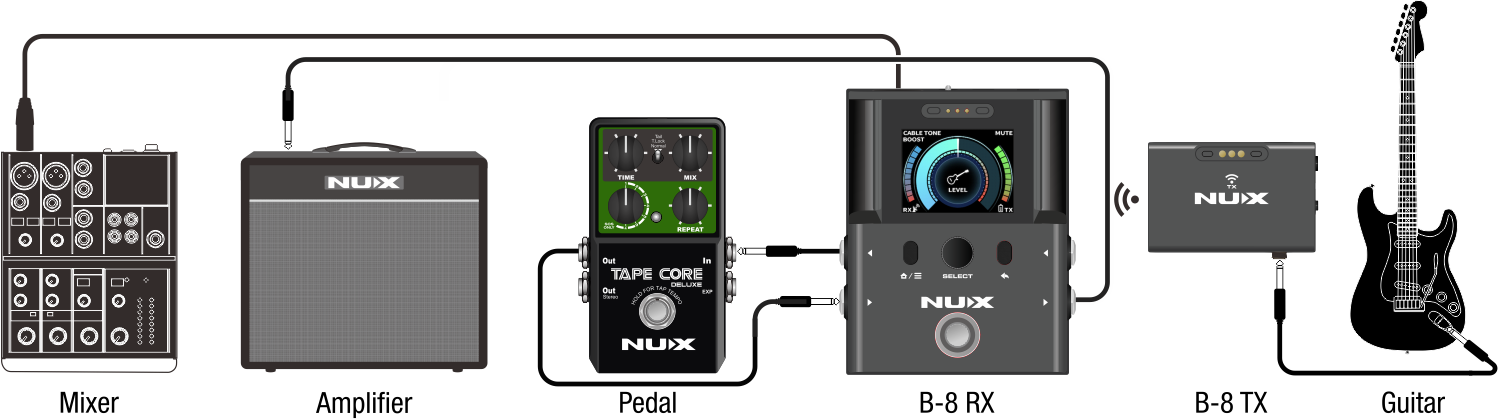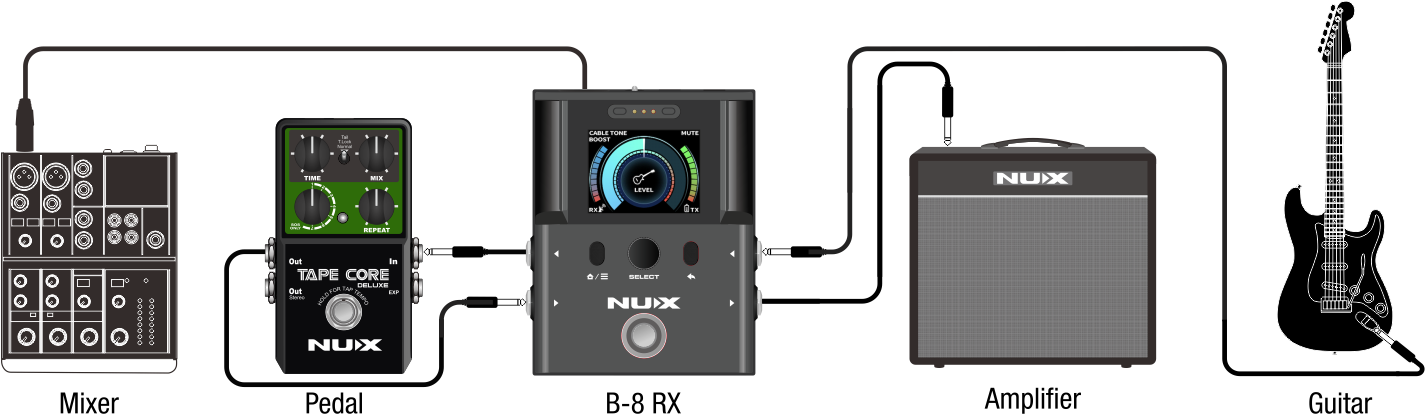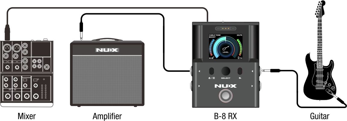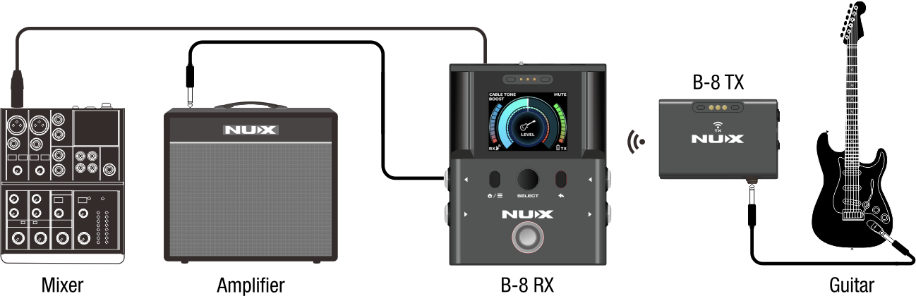 將吉他連線到TX,並將RX連線到放大器或混音器,或兩者兼而有之。
