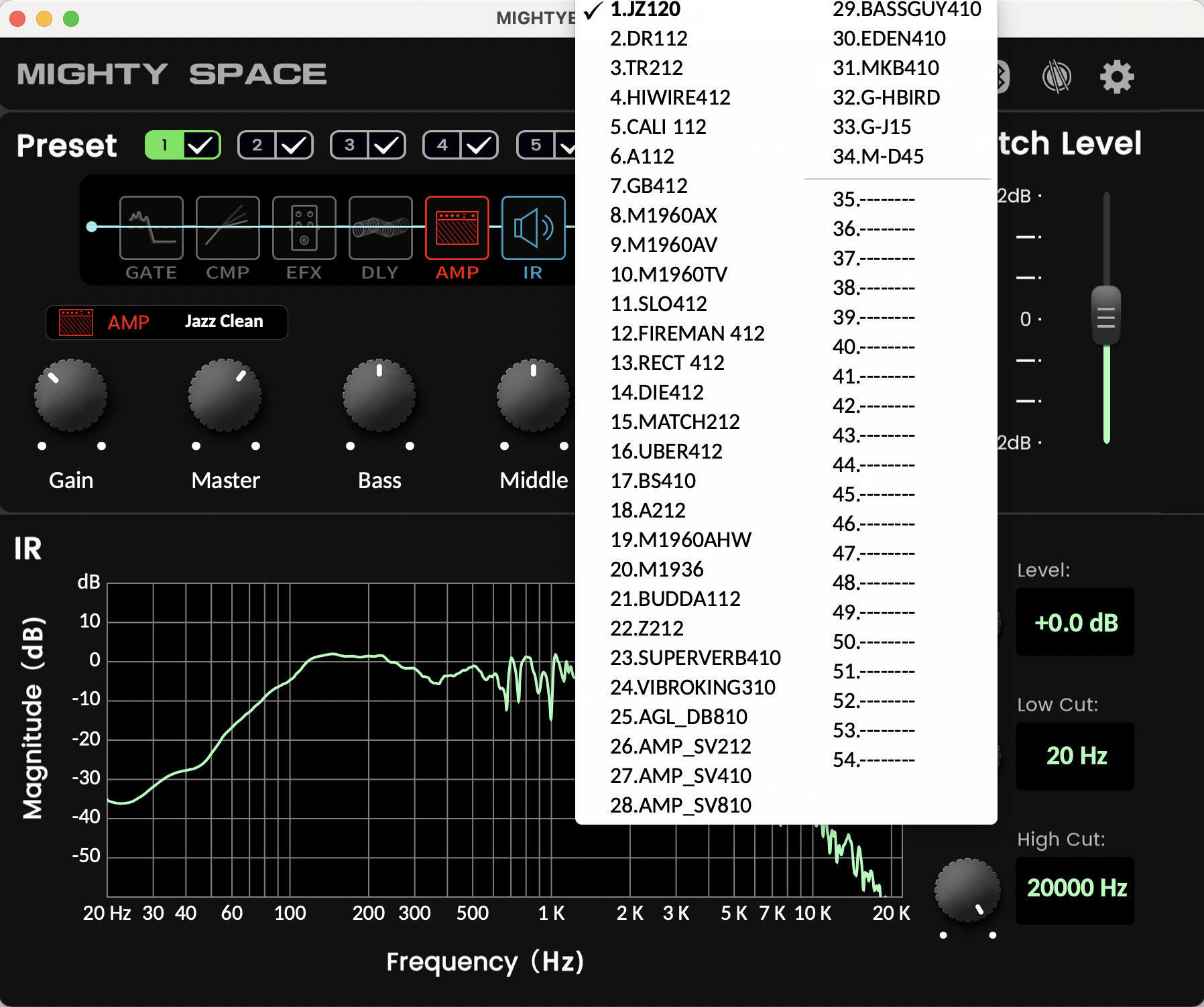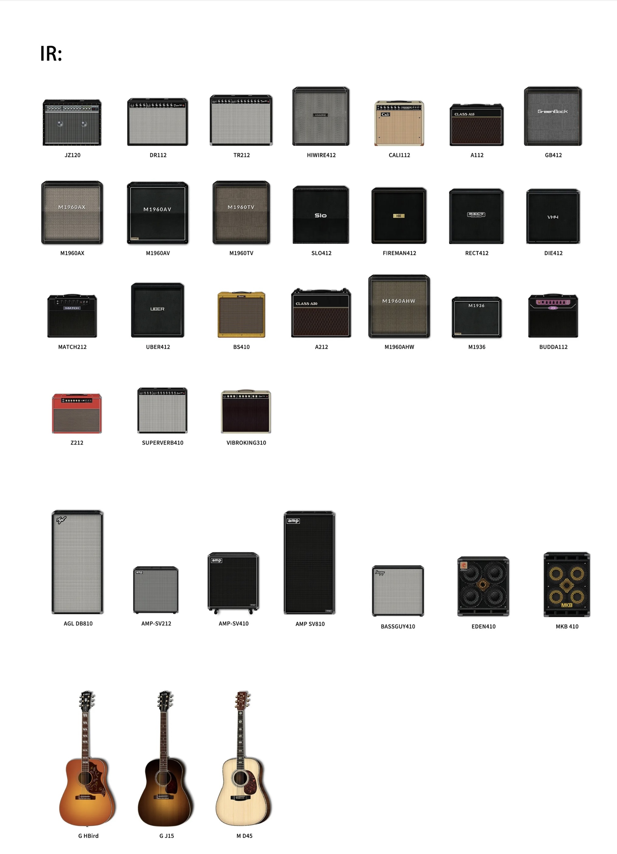 Impulse Responses吉他箱體 IRs:JZ120, DR112, TR212, HIWIRE412, CALI 112, A112, GB412, M1960AX, M1960AV, M1960TV, SLO412, FIREMAN 412, RECT 412, DIE412, MATCH212, UBER412, BS410, A212, M1960AHW, M1936, BUDDA112, Z212, SUPERVERB410, VIBROKING310