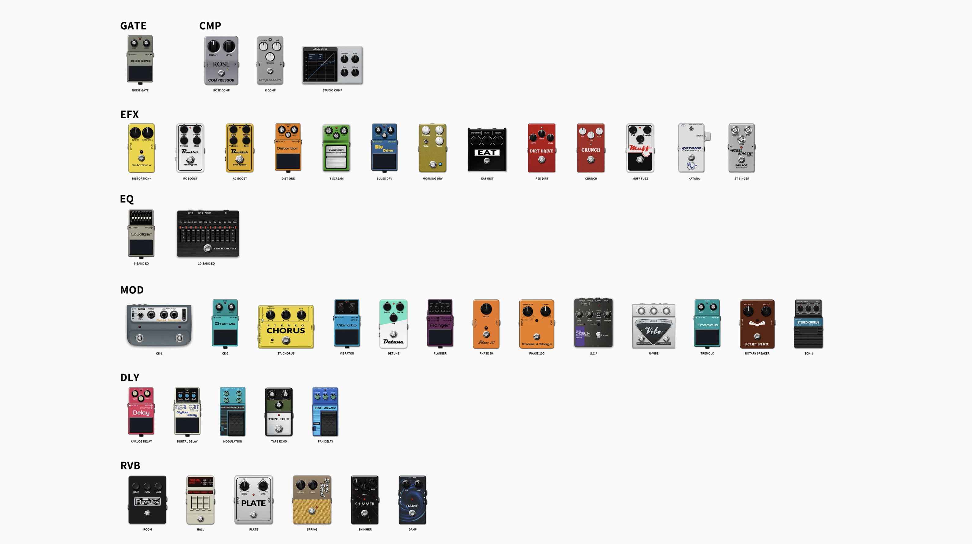 - 具有豐富效果器模擬(GATE, CMP, EFX, EQ, MOD, DLY, RVB)