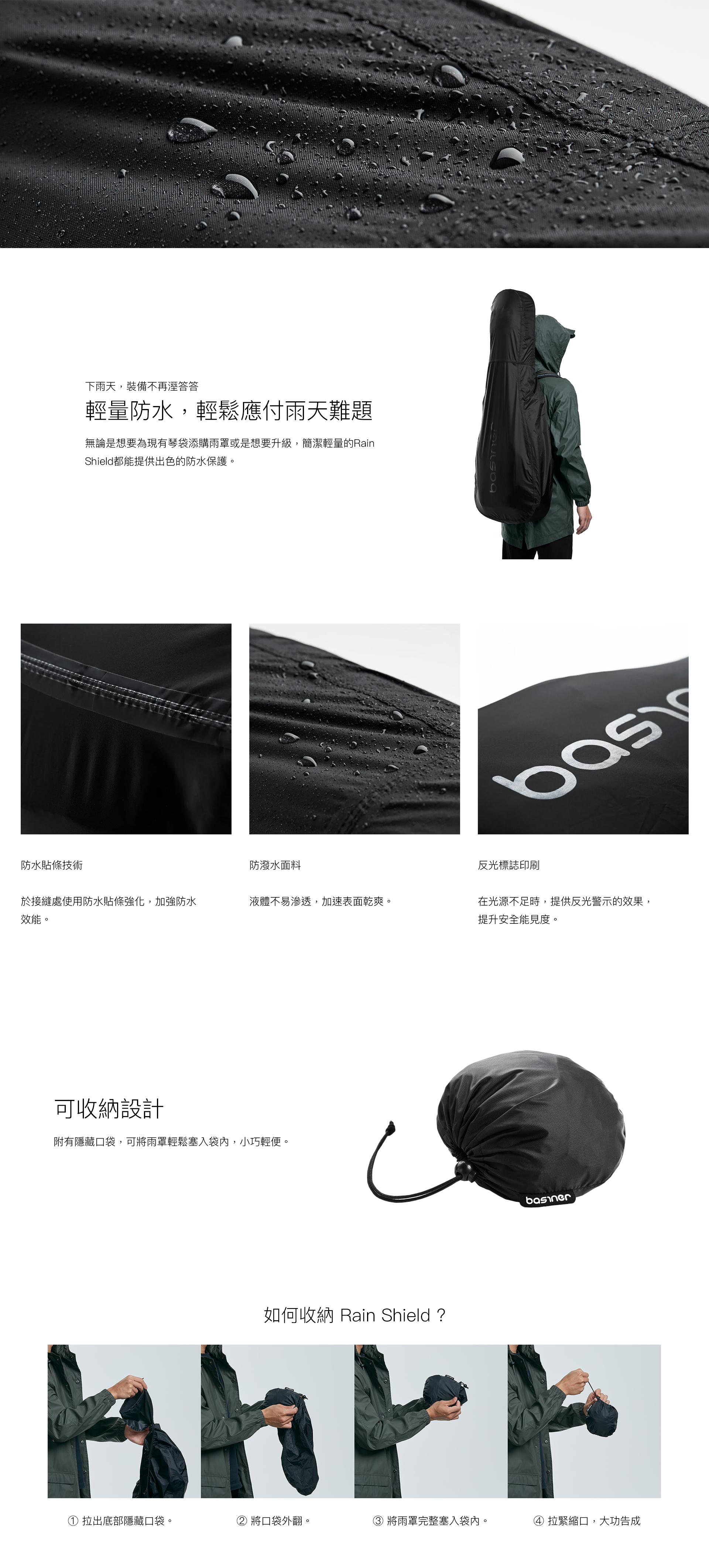 basiner特製雨罩-RAIN SHIELD以雙縫線工法製成並在接合處採用防水貼條技術,可在雨天外出時保持裝備乾燥,加上內建口袋設計,可直接將RAIN SHIELD收納成小袋,輕巧不佔空間。