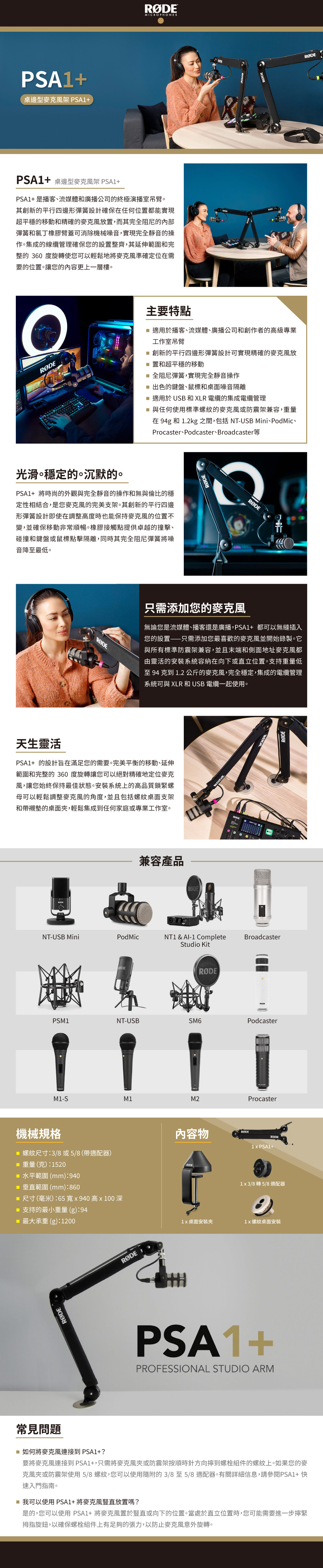 > 兼容任何使用標準螺紋的麥克風或防震架,重量在 94 克到 1.2 千克之間,包括 NT-USB Mini、PodMic、Procaster、Podcaster、Broadcaster等