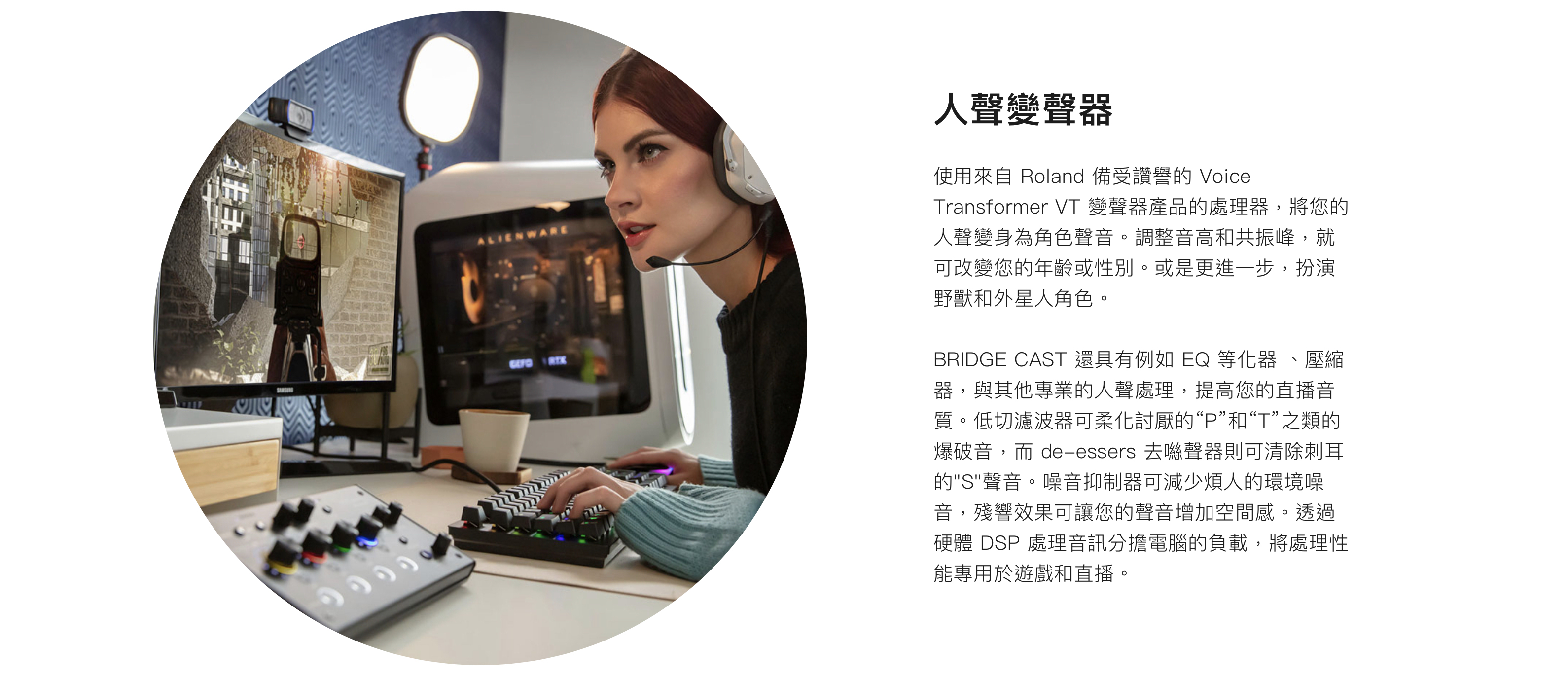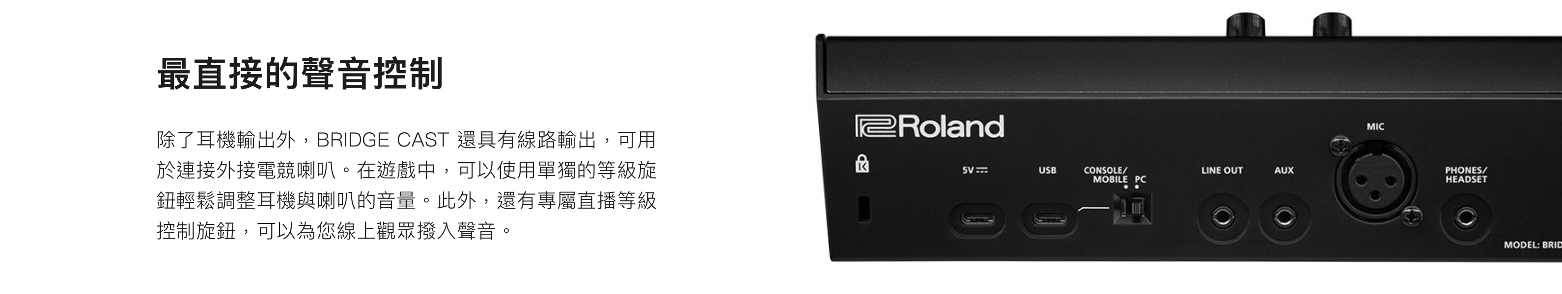 BRIDGE CAST 為您每場競賽提供卓越的音效,配上殺手級的聲音工具,幫助您在電境界闖出名號。50 多年來,Roland 一直是電子音樂和音訊/影像設備領域的創新領導者。在您的配備中加入 BRIDGE CAST,您可以為您的直播粉絲提供深受全球數代頂尖創作者信賴的優質聲音。