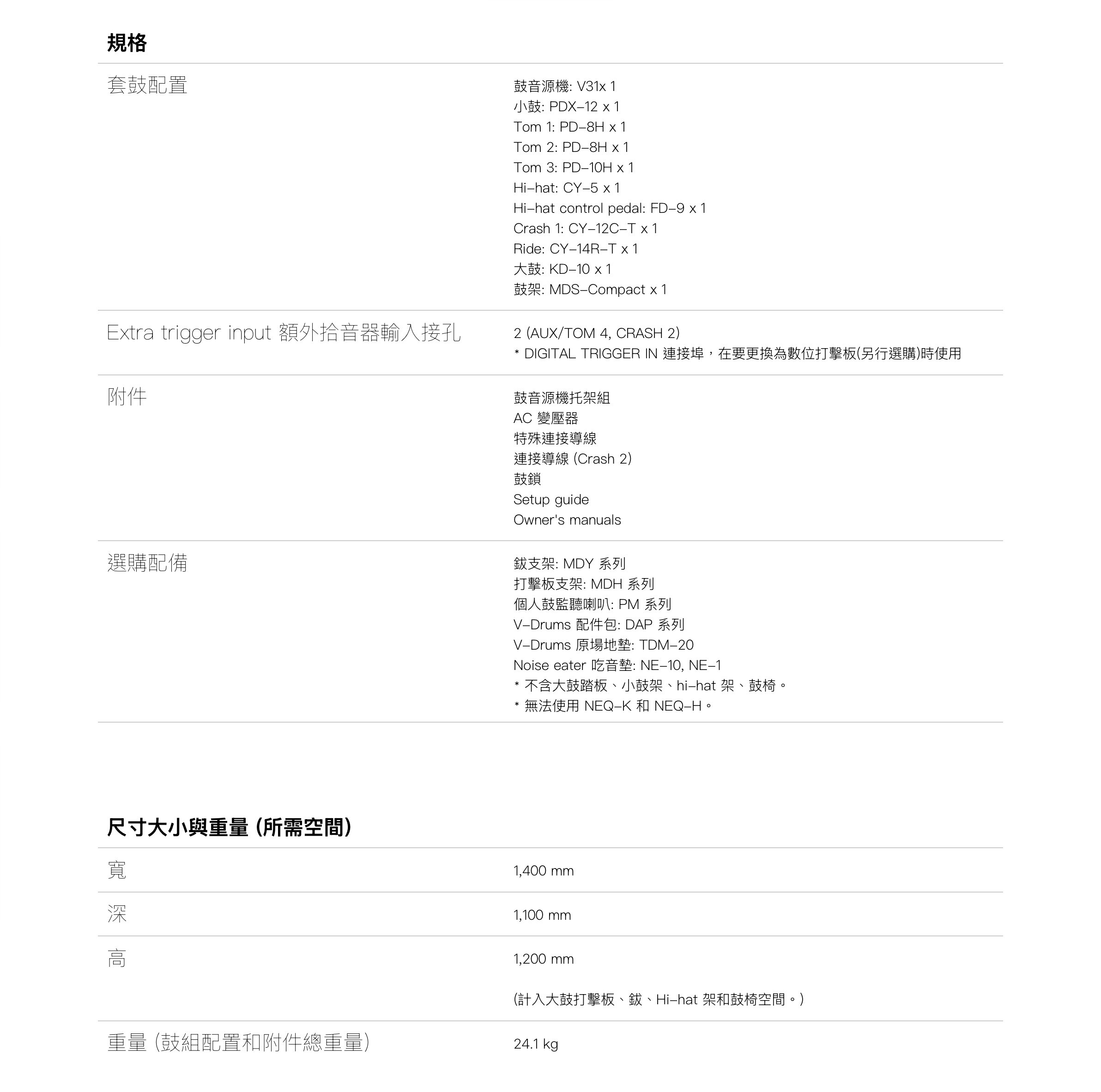 V-Drums 3 系列為您帶來次世代 V-Drums 的表現力和靈活性,適用於日常練習和居家宅錄。V31 鼓音源機採用與我們高階套鼓的 V71 和 V51 音源機相同的旗艦級引擎,提供豐富、多重取樣的內建音色,並可無縫轉為 DW Soundworks 軟體進行電腦鼓樂創作。您還可以獲得強大的工具來鍛鍊演奏技巧與即興、升級的鼓配置提高演奏力,以及內建無線連接,可使用 Roland Cloud 上不斷增加的音色擴展和其他 V-Drums 組件。