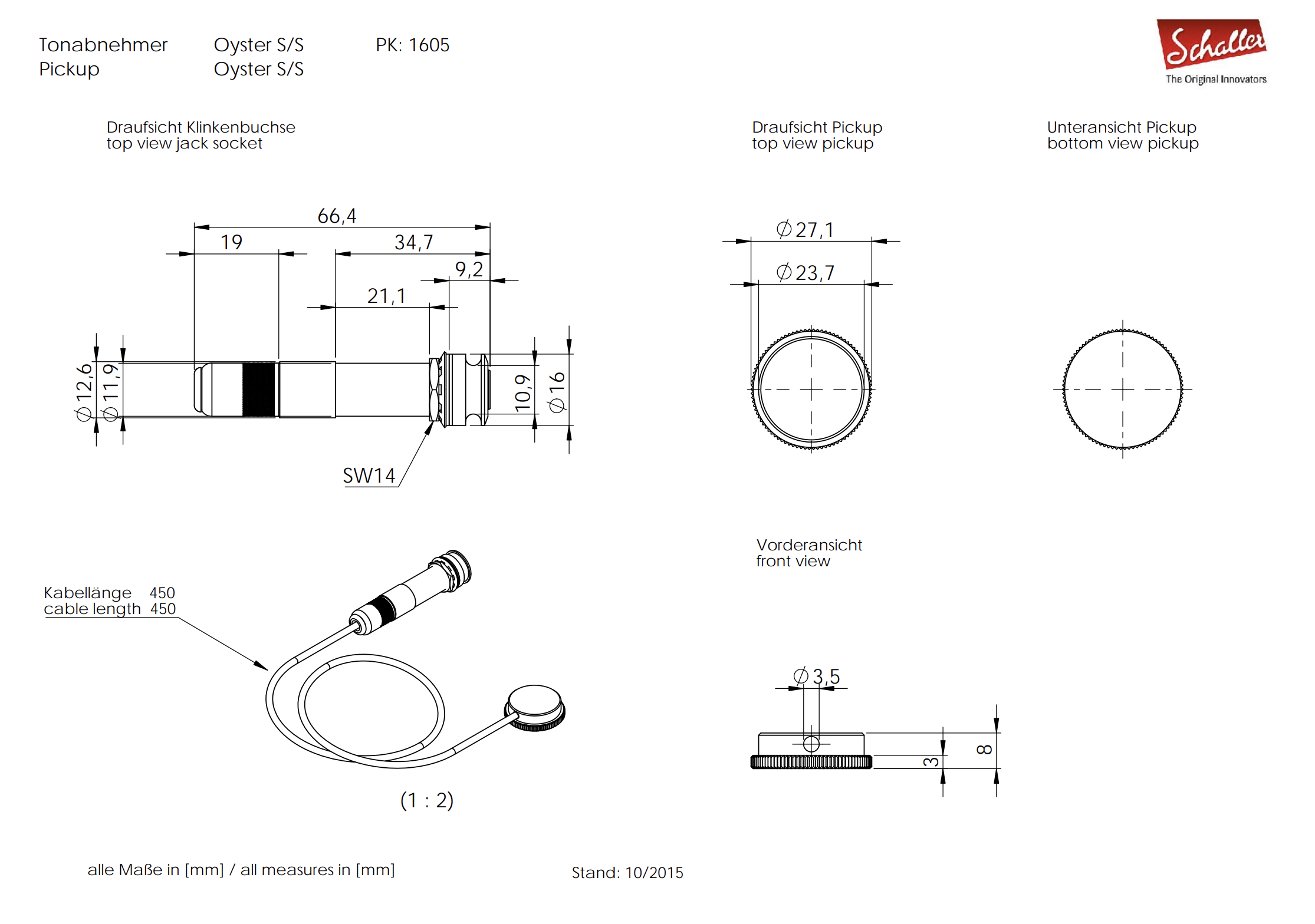 Schaller Oyster 有三種不同版本:單版本(S/S 或 S/P)或雙版本(D/S)。 D/S 的兩個 Oyster 壓電陶瓷可提供更寬的頻譜。它可以輕鬆安裝到隨附的 6.35 毫米(1/4 英吋)直徑插座或插頭上。