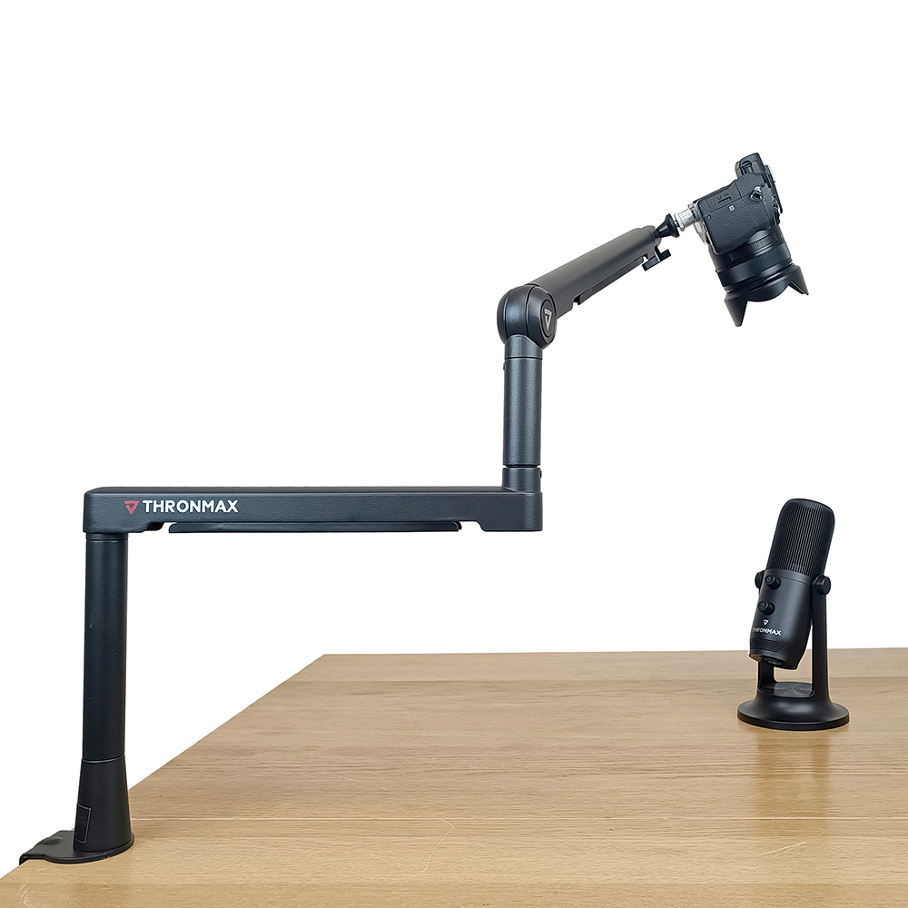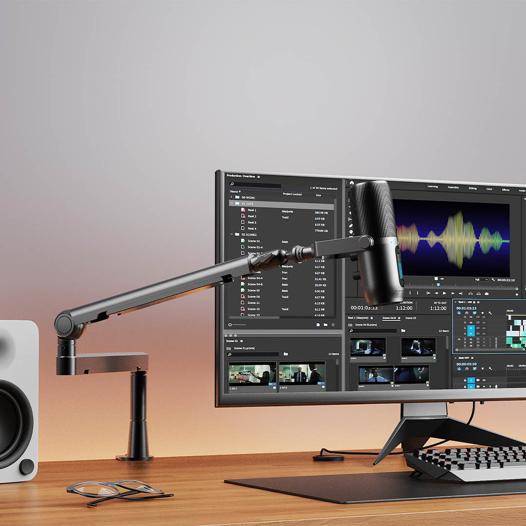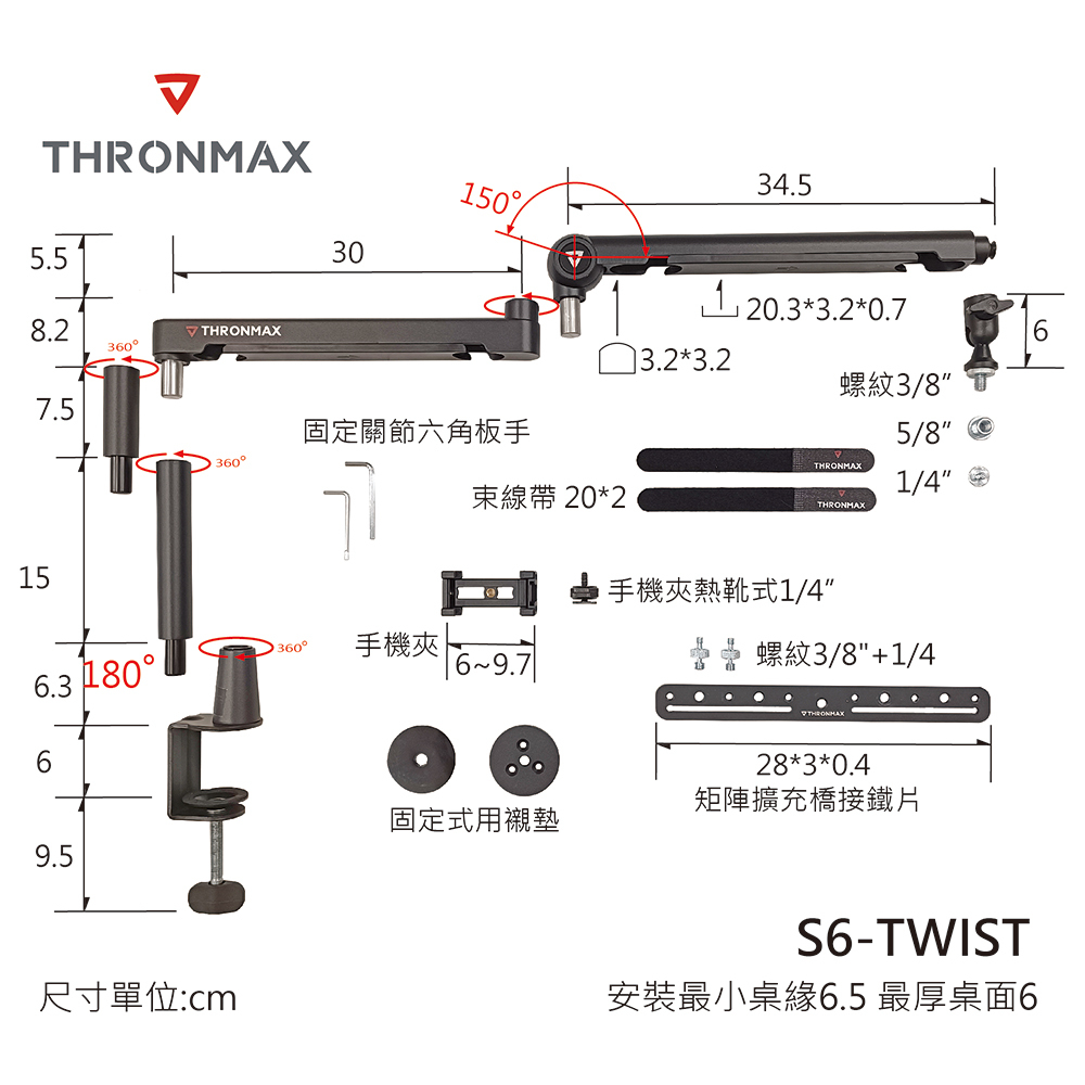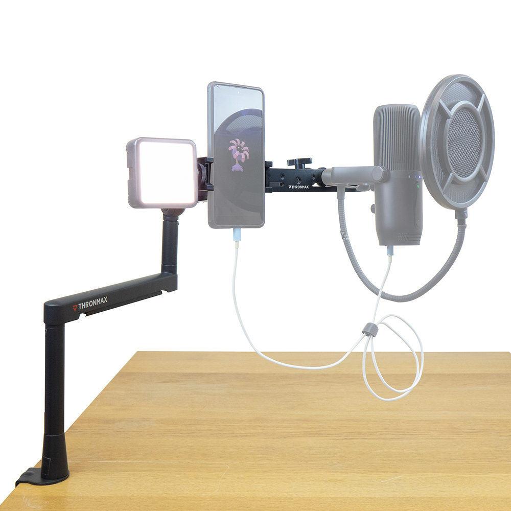 末端萬向球夾具搭配1/4"、 3/8"、 5/8"螺紋的轉接頭,可使用麥克風、攝影器材、手機或攝影燈