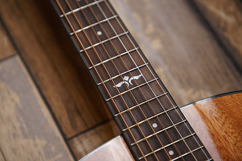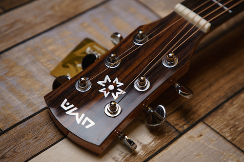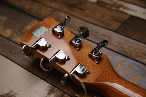 玫瑰木琴頭貼片造型,搭配白色貝殼鑲嵌LOGO。並使用封閉式吉他弦鈕,調音簡單輕鬆、不易走音