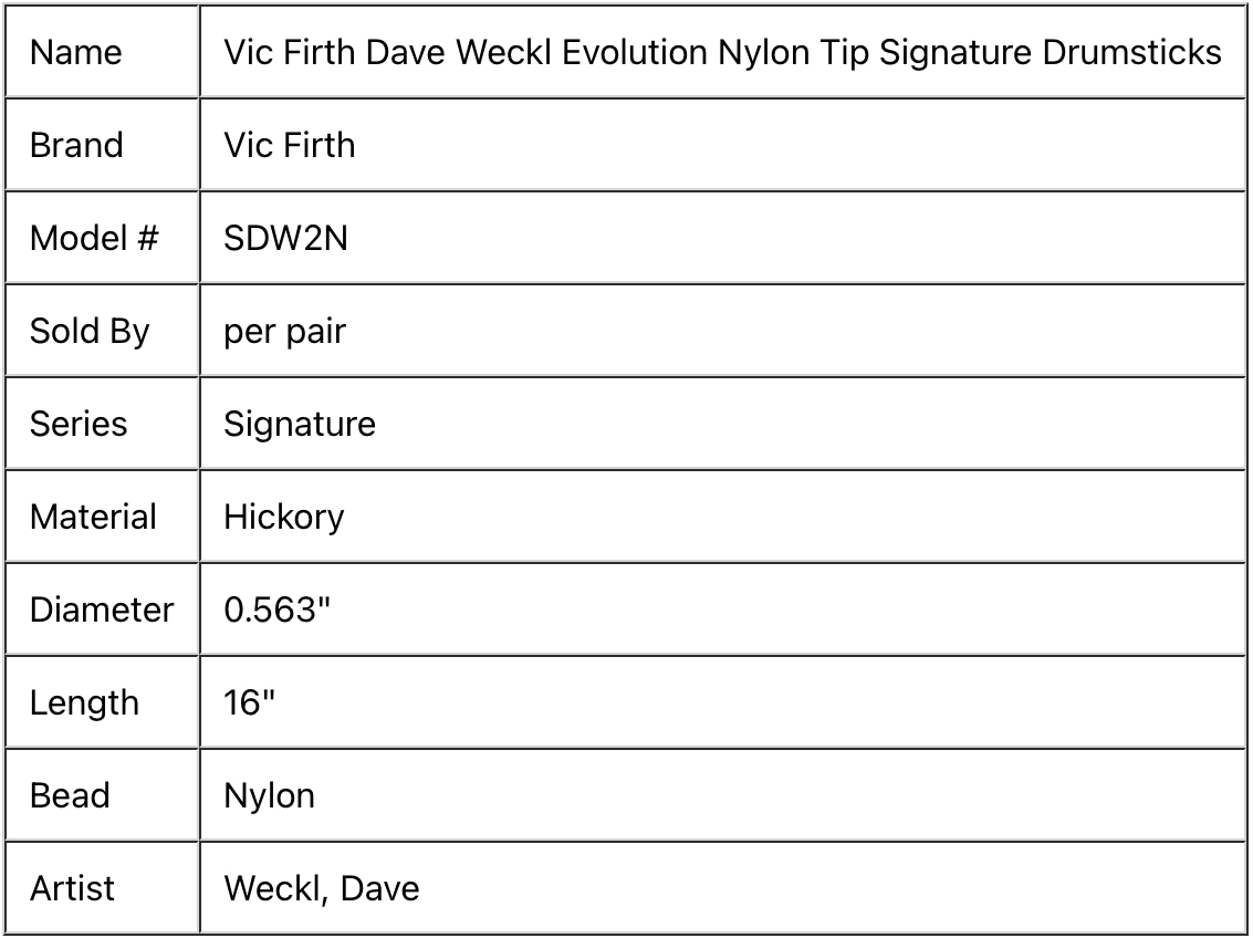 Vic Firth SDW2N Dave Weckl Evolution Nylon Drumsticks feature a short nylon tear drop tip on a 5A shaft. Provides superior cymbal definition with excellent rebound.