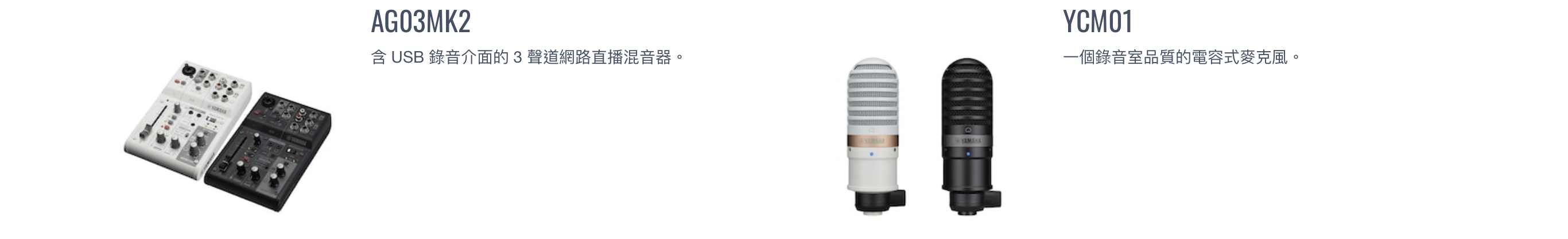 套裝內容:AG03mk2網路直播混音器、YH-MT1高傳真頭戴式耳機、YCM01 心型指向電容式麥克風、XLR麥克風線