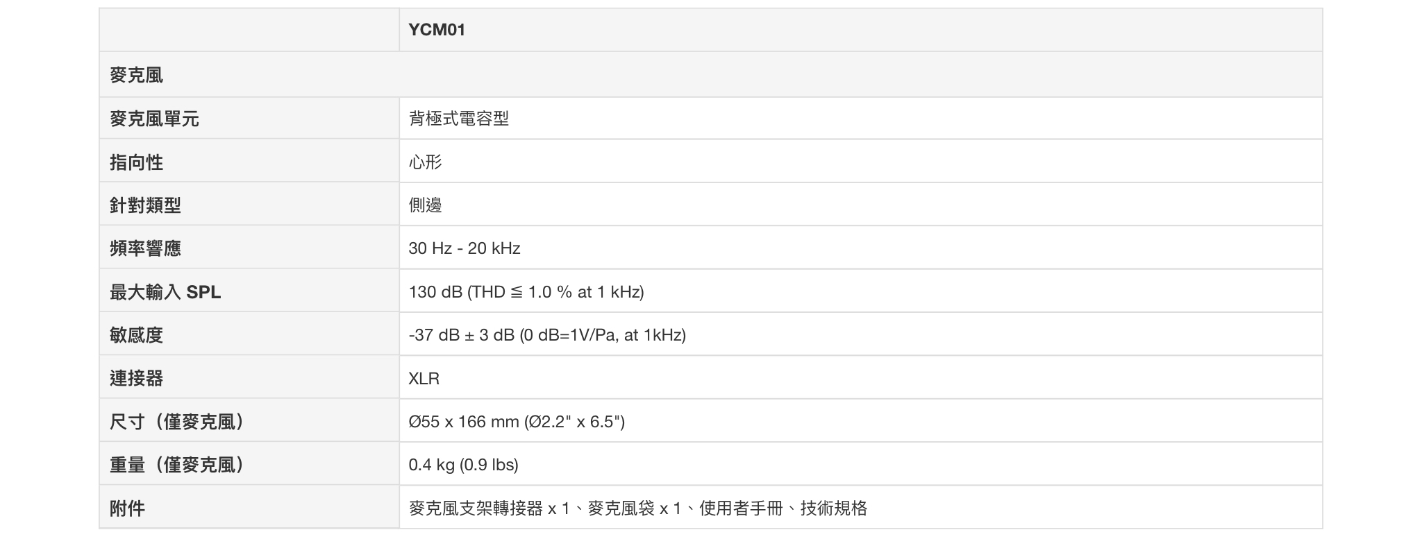 -YCM01:錄音室品質的電容式麥克風(XLR,心型指向型)
