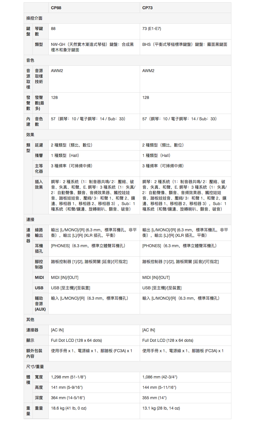 CP73 和 CP88是同類產品中最輕、最小巧的樂器之一。CP88 重量僅 18.6 公斤,而 CP73 重量是 13.1 公斤。(原廠另有專屬軟殼保護套可選購,滾輪設計方便拖拉攜行,拉鍊隔間可放置踏板及配件)