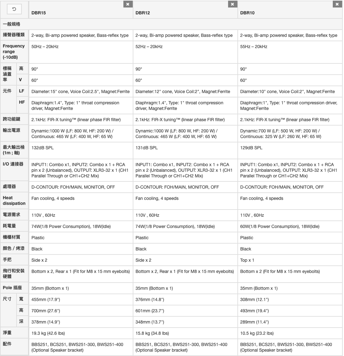 DBR系列喇叭配備了重量輕、高效能的D類擴大機,能夠釋放出1000W的功率,產生高達131dB的SPL,傳送出非凡的清晰度和動態準確度。
