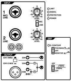 DBR 系列喇叭擁有兩個輸入頻道。CH1中的combp接端可以滿足XLR和TRS Phone 接頭,可以選擇切換麥克風和線性輸入信號。CH2提供了兩個輸入選擇,其一是可以接受XLR 或TRS Phone 的combo接端,另一個是RCA pin接端,可用於CD播放器或其他立體聲線性音量音源。內建的混音器提供了兩種混音選擇,CH1+2 MIX可以用於CH1和CH2的混音,CH1 THRU 可以僅使CH1中的信號通過。
