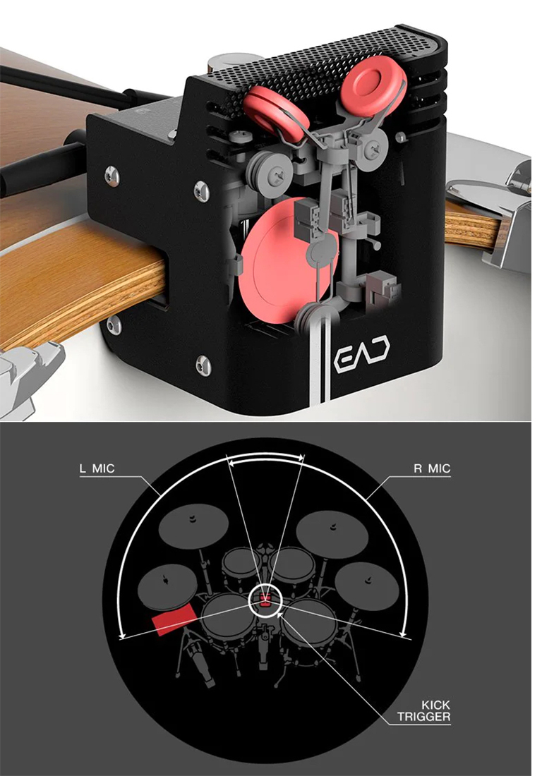 AD10 簡化了通常需要麥克風、纜線、混音器和 PA 專業知識的複雜收音設定。只需將 EAD10 感應器裝置安裝到任何原音低音鼓,就可展現出整個傳統鼓組的高品質立體聲。可以立即將您的傳統鼓組添加採樣音色和錄音室品質的數位效果,並將您的鼓聲轉換為強大的數位/電子混合音樂。另外您也可以與音樂庫中的曲目中一起演奏並錄製鼓聲,或是進行網路分享。