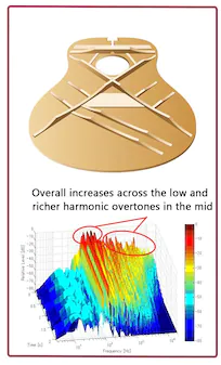透過分析與模擬技術設計出有別於傳統的最佳支撐設計。新的扇形支撐音樑加強琴體面板的耐久性,