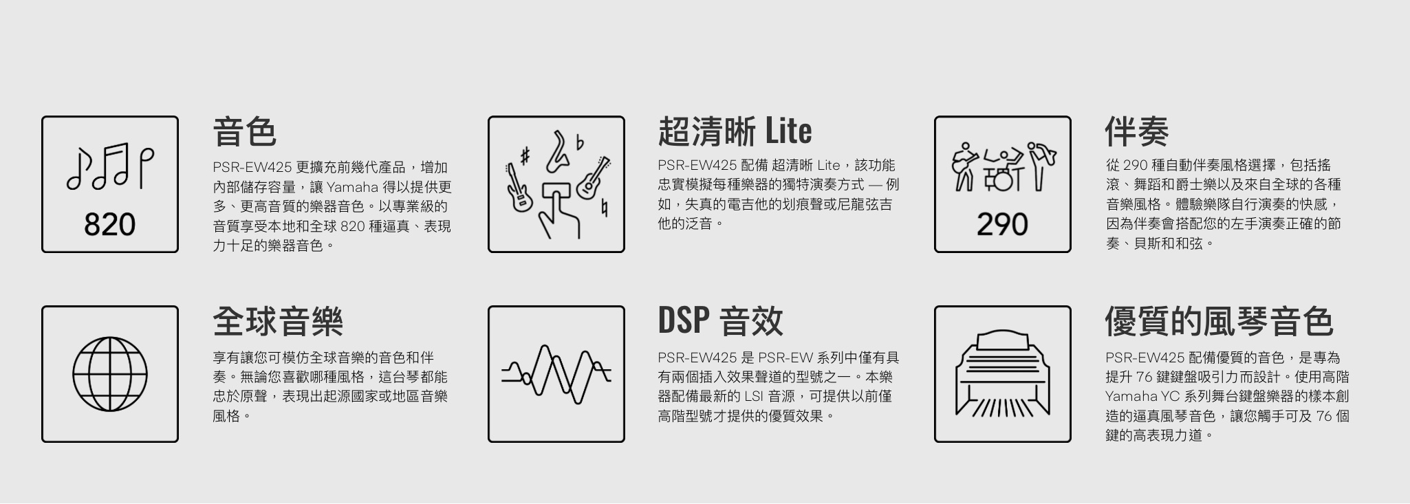 PSR-EW425 具有 76 鍵觸鍵感應鍵盤和功能,這些功能是以著名的 PSR 系列可攜式鍵盤為基礎並進行改進,PSR-EW425 提供強大的功能和效能,讓您的音樂表現更上一層樓。