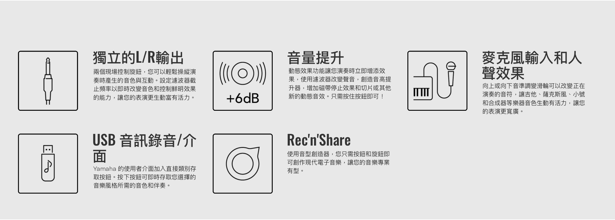 多種連接選項,提供練習、演奏和表演所需的所有支援。插入麥克風,可一邊演奏一邊嘗試唱歌,使用 Rec'n'Share 應用程式與大家分享您的音樂,並連接到 PA 系統,讓您在舞台上表演。