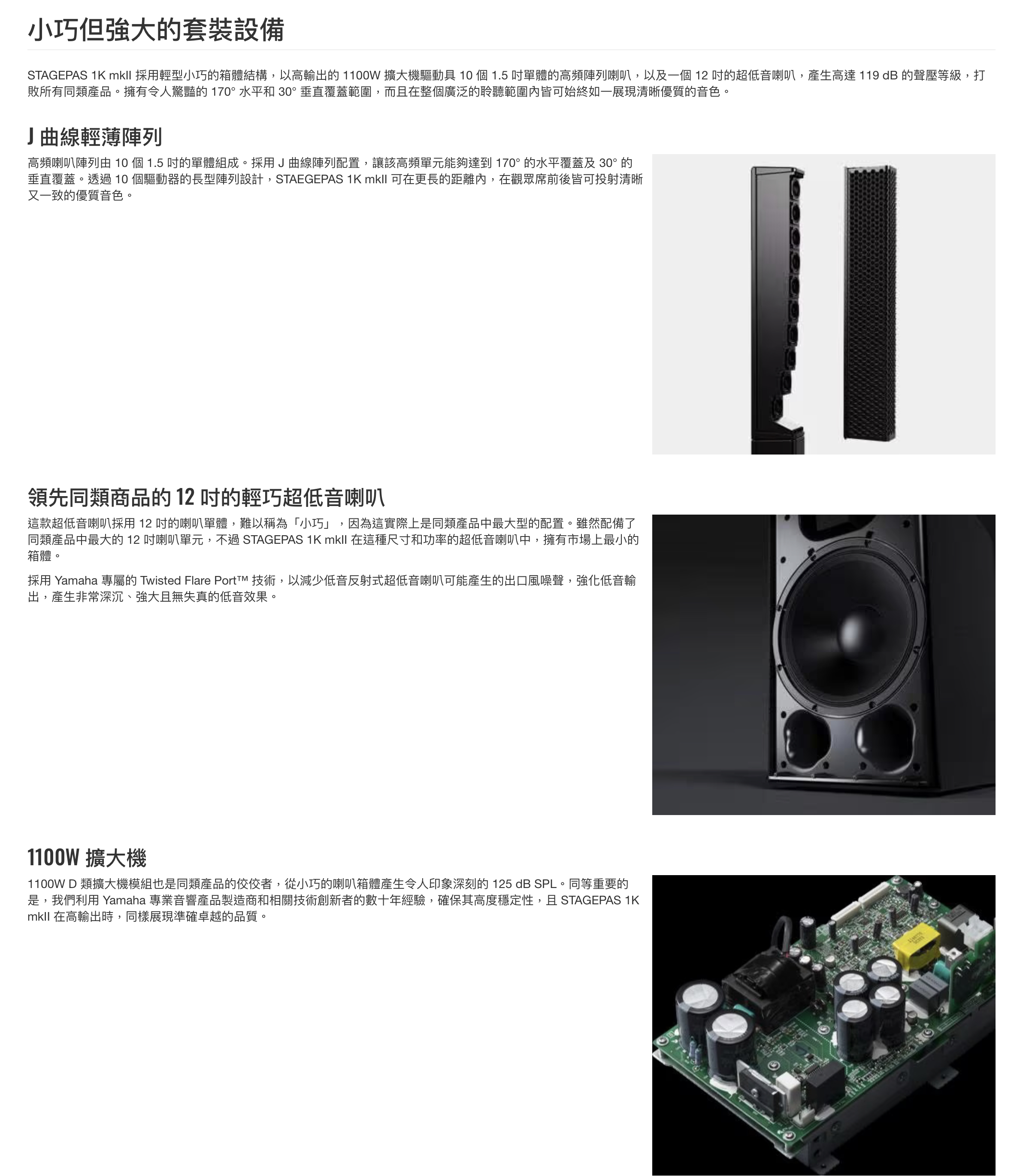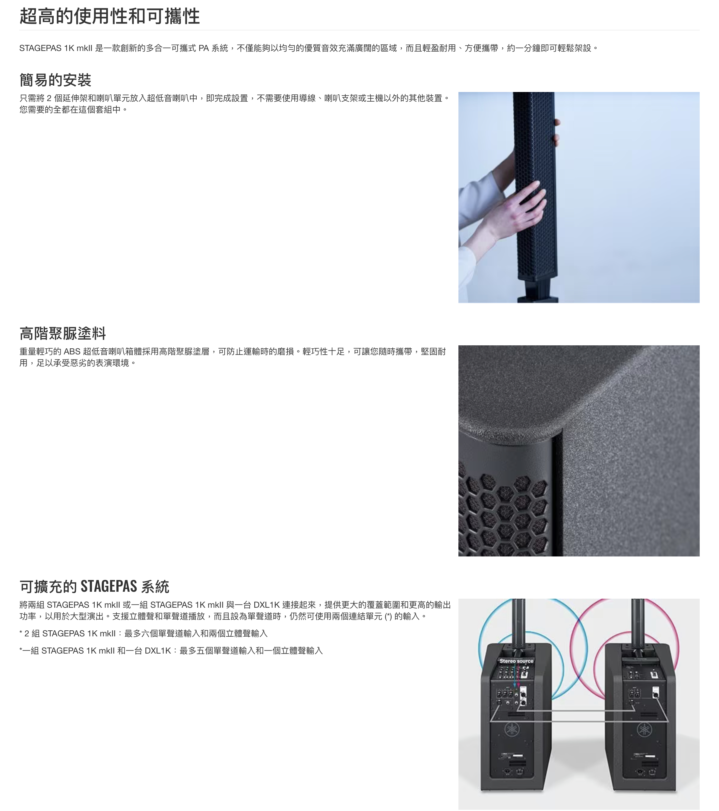 STAGEPAS 1K mkII 是一款多合一的可攜式 PA 系統,可讓您輕鬆又快速地將任何地方轉變成您的舞台,用簡單的配置展現專業級的音效表現,讓滿懷抱負的樂手可專注於音樂並盡情發揮他們的表演。第二代的STAGEPAS 1K mkII 比上一代多了更高的聲壓等級和更靈活的遙控功能,同時具有相同的輕盈箱體設計、專業混音功能,以及簡易操作的組合,讓 STAGEPAS 多合一套裝達到超出其他可攜式 PA 的境界。Yamaha 數十年來為音樂工程和音樂製作的每個階段打造創新的專業音響設備,而我們凝聚了這數十年所累積的獨特經驗和專業知識,透過音樂會品質的混音機和喇叭,將可攜式 PA 的標準提升到新的境界。