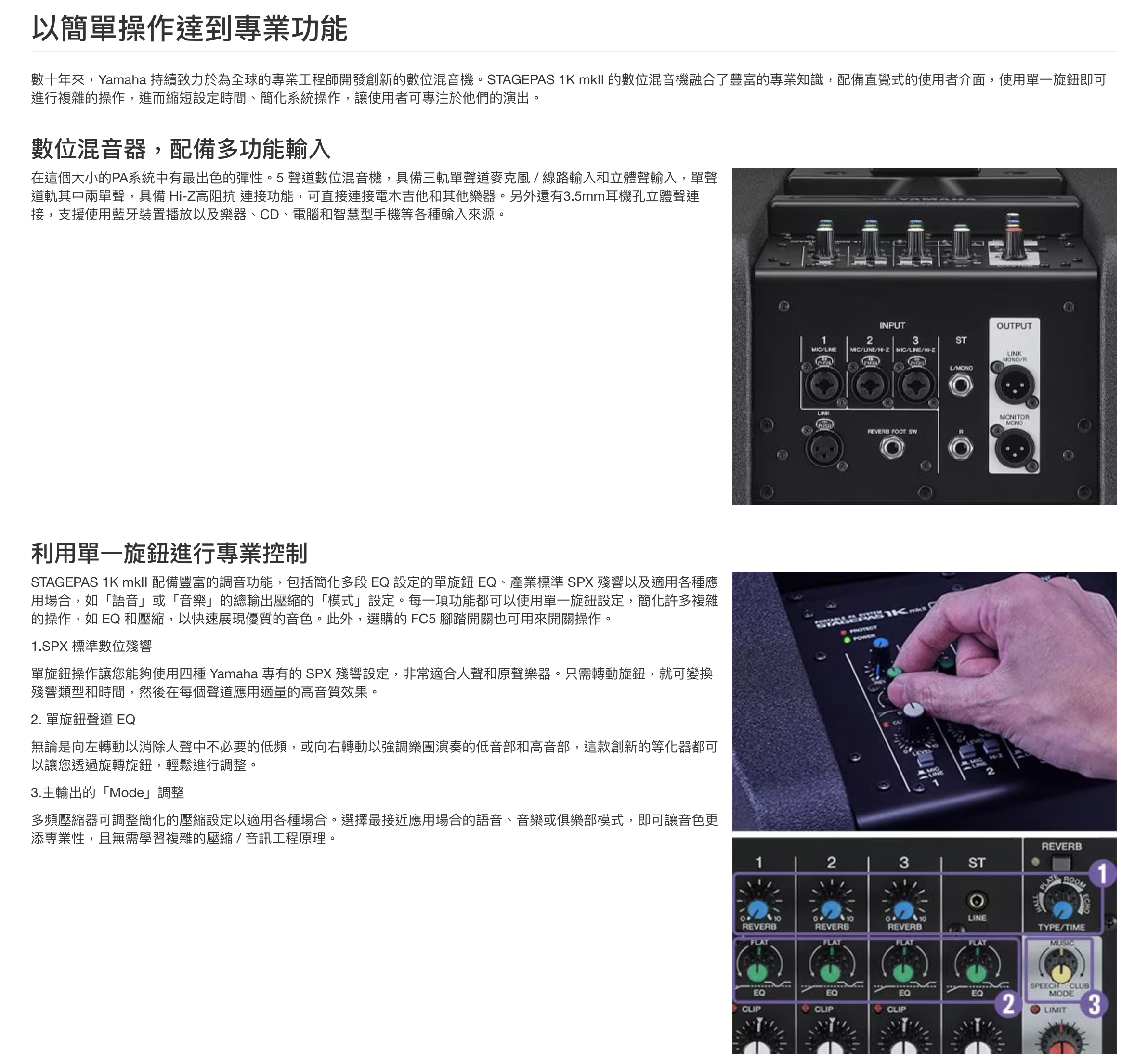 STAGEPAS 1K mkII 配備豐富的聲音調整功能,包括同時執行多個 EQ 流程的單旋鈕 EQ,而「模式」可讓您調整最佳化的壓縮設定,如「語音」或「音樂」,以適用各種應用場合。只要單一旋鈕即可完成所有的調整,無需學習複雜的作業流程就可快速輕鬆地得到完美的混音,讓您能夠專注於您的演出。