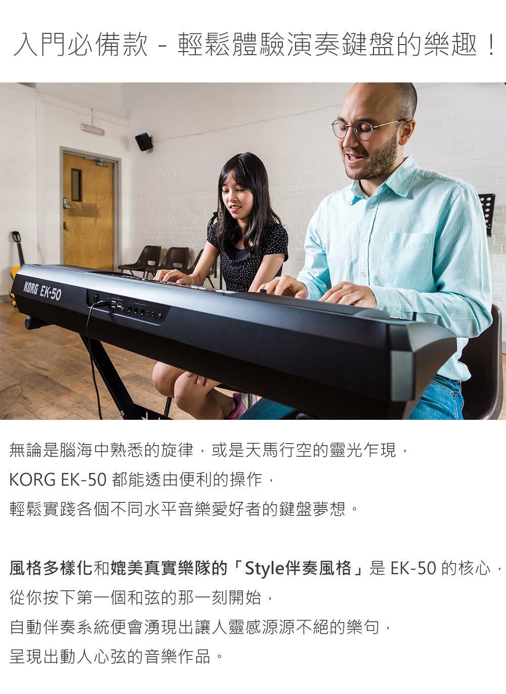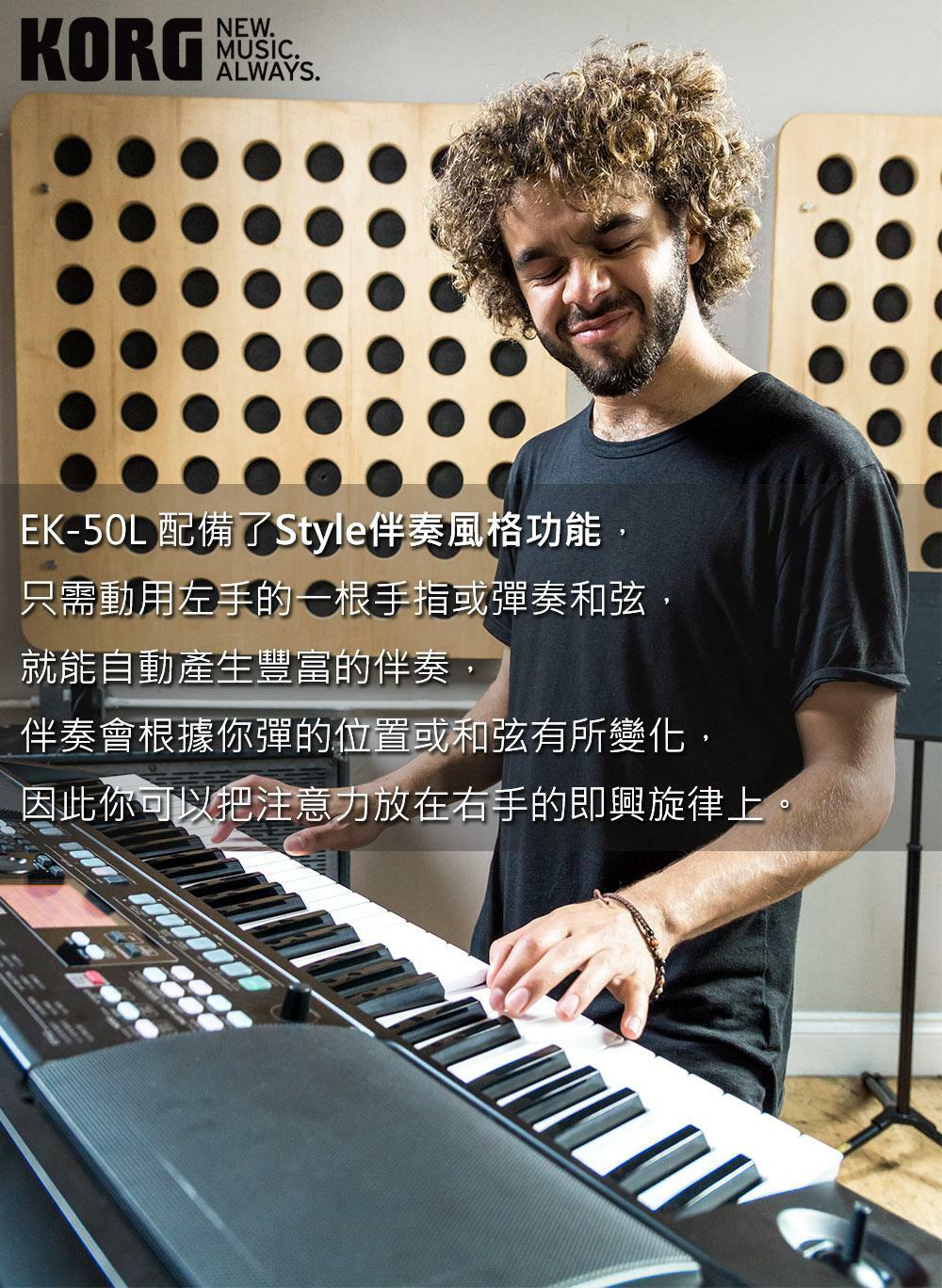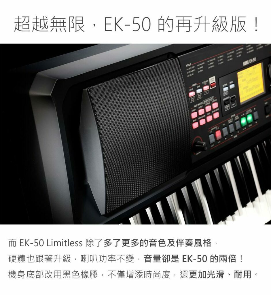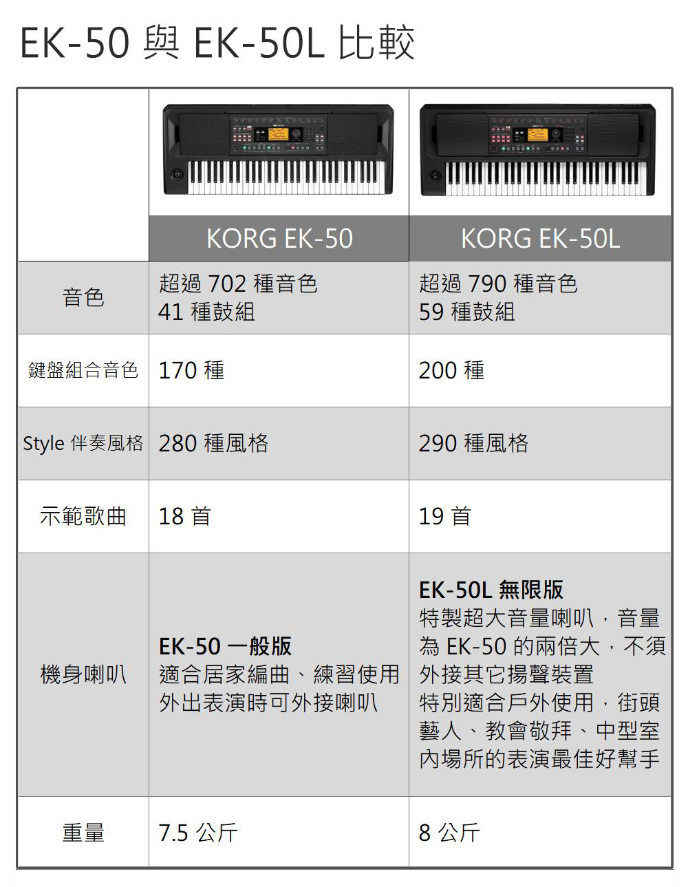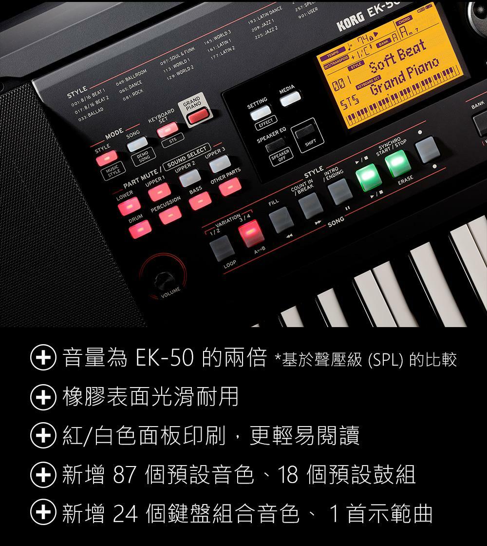 EK-50 是 KORG 廣受歡迎且平易近人的基本必備款,而 EK-50L 除了多了更多的音色及伴奏風格,硬體也跟著升級,喇叭功率不變,音量卻是 EK-50 的兩倍!機身底部改用黑色橡膠,不僅增添時尚度,還更加光滑、耐用。