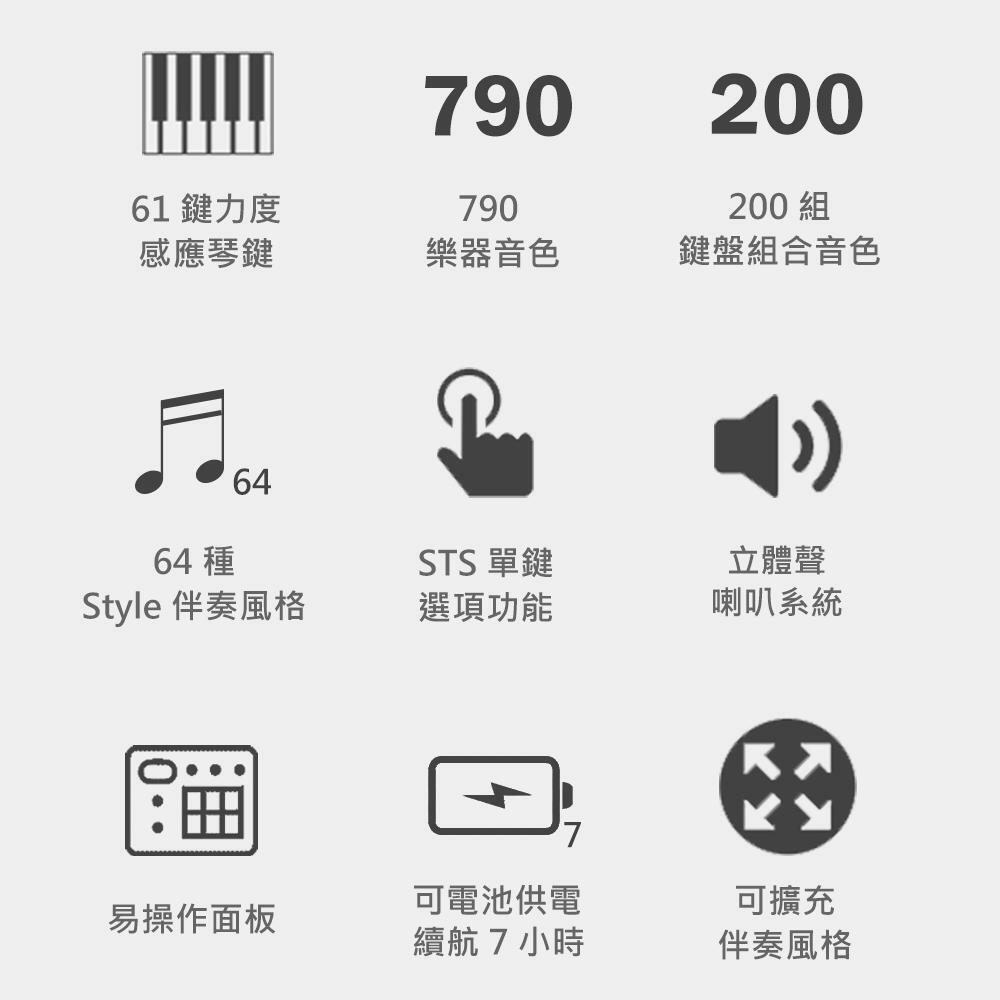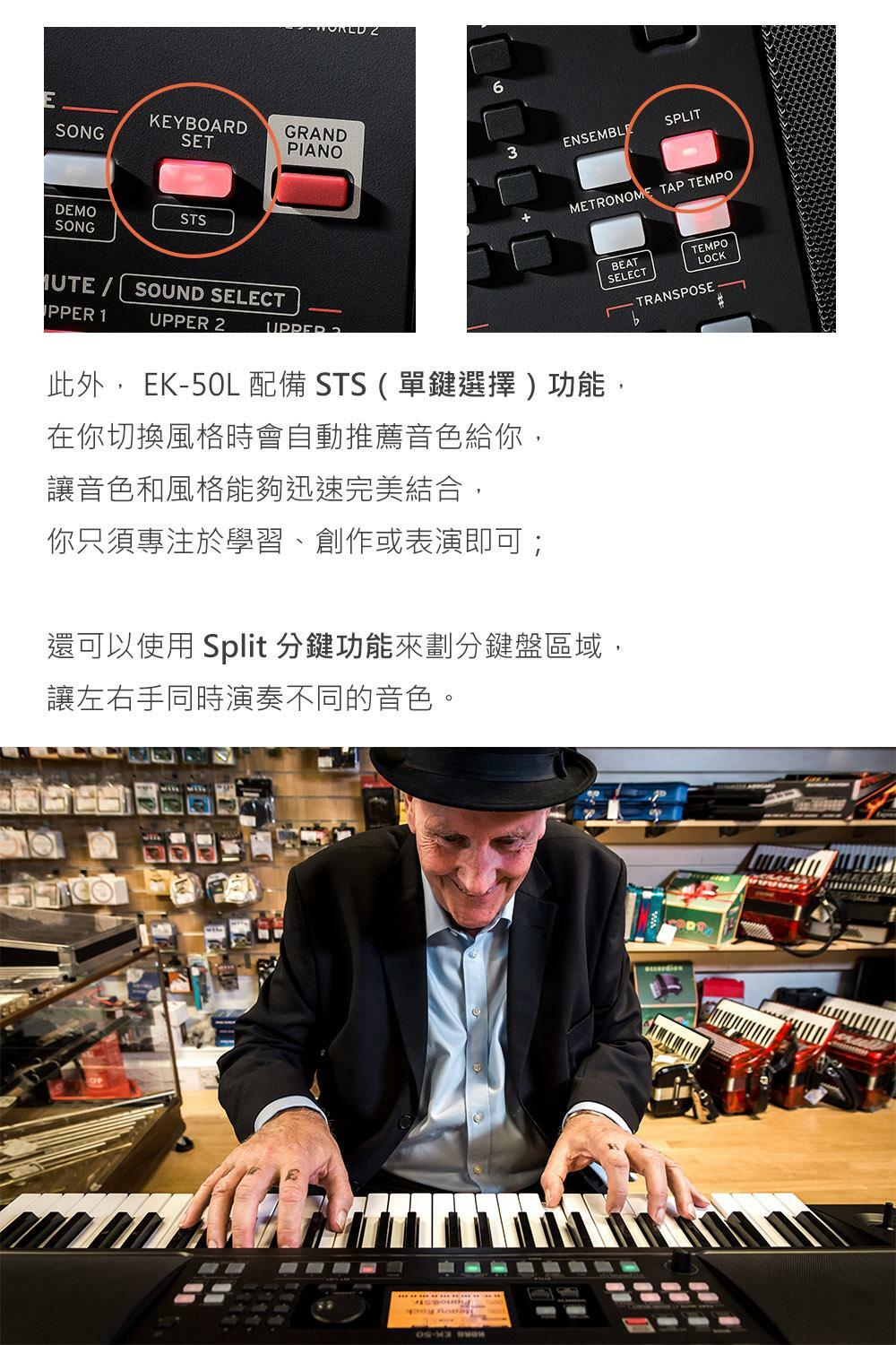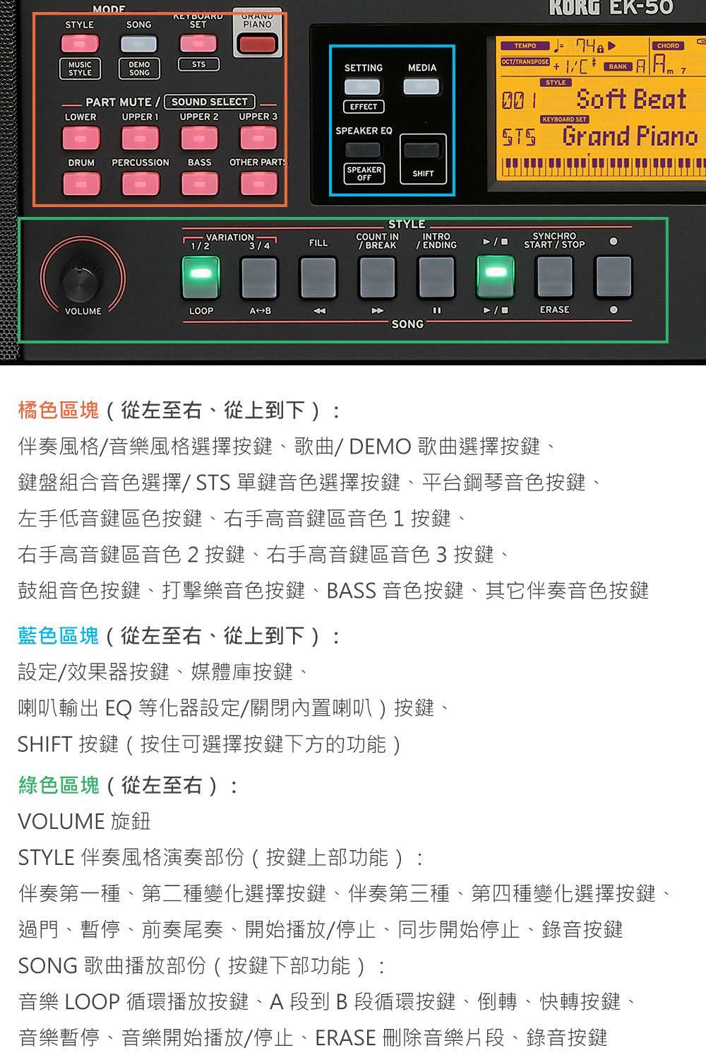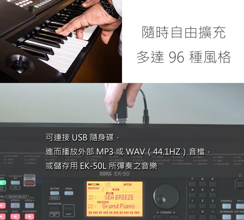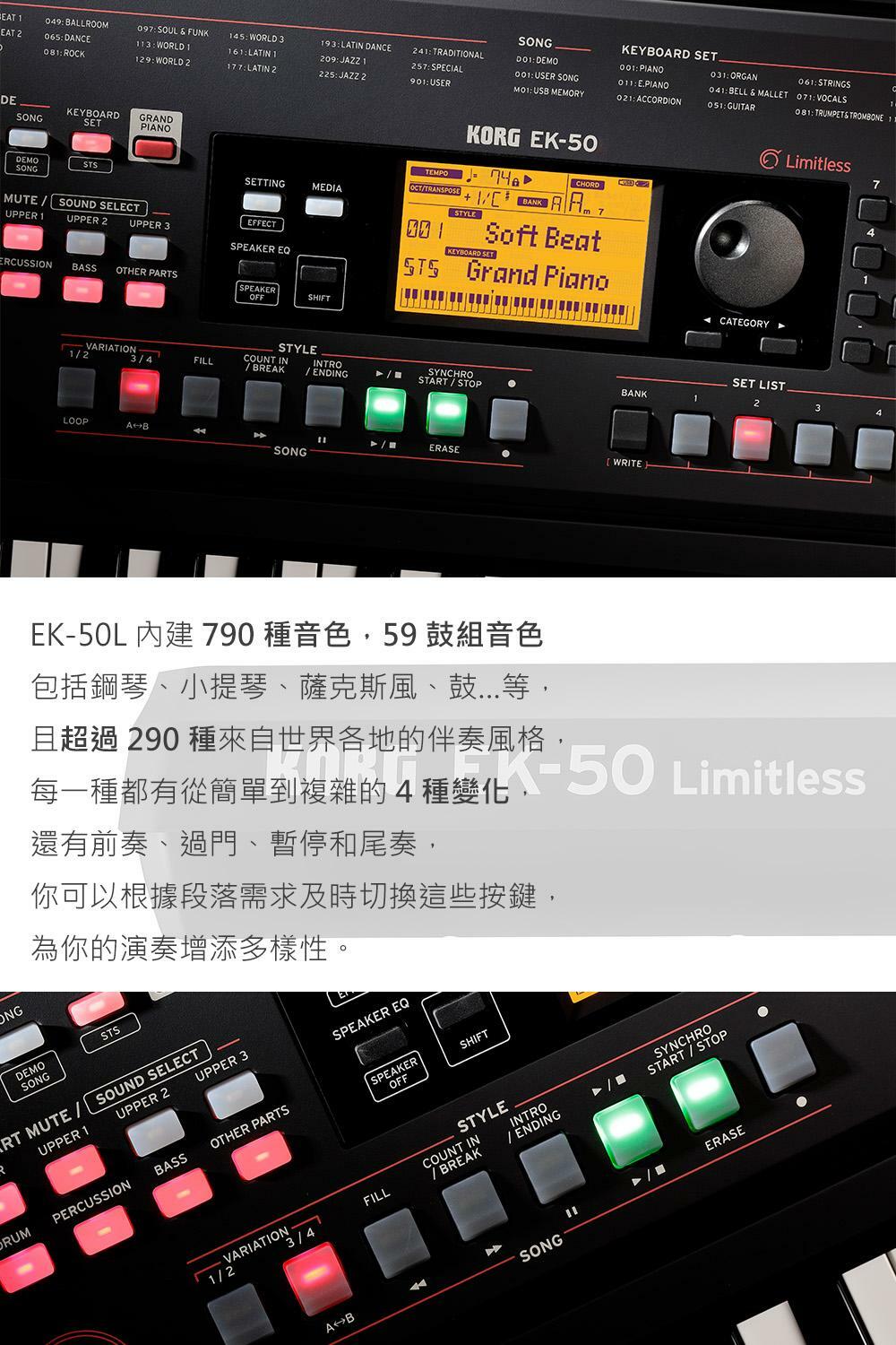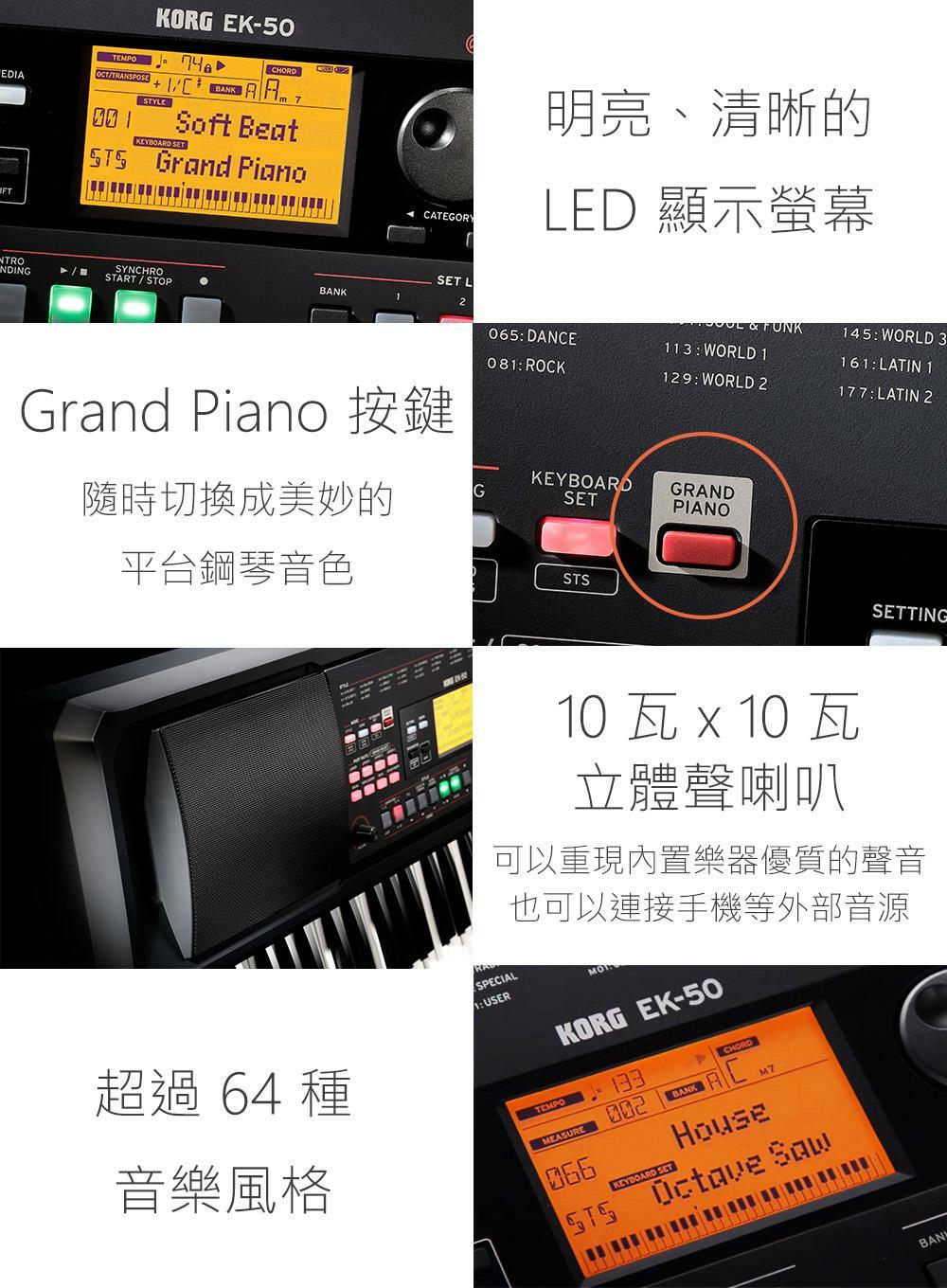 EK-50 是 KORG 廣受歡迎且平易近人的基本必備款,而 EK-50L 除了多了更多的音色及伴奏風格,硬體也跟著升級,喇叭功率不變,音量卻是 EK-50 的兩倍!機身底部改用黑色橡膠,不僅增添時尚度,還更加光滑、耐用。