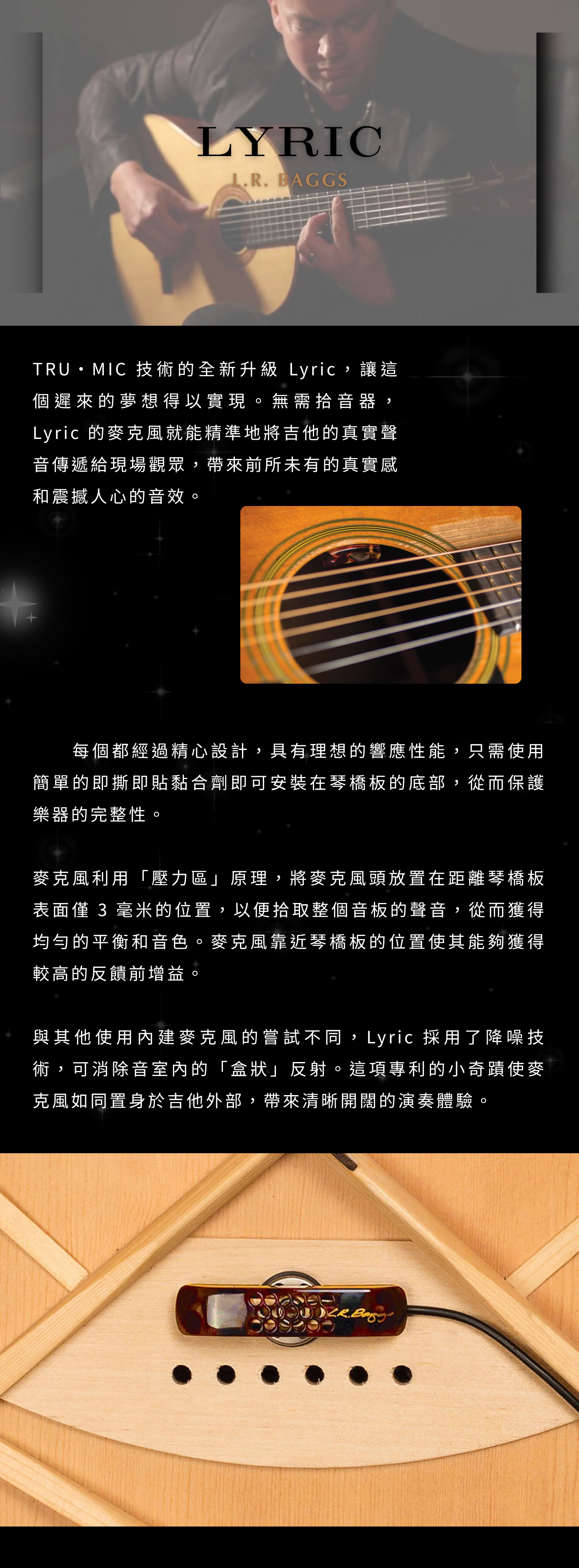 Lyric 是 TRU•MIC 技術的升級版,提供專為現場演出打造的錄音室等級麥克風保真音質。該系統包含內建麥克風、高傳真麥克風前級擴大機、音孔音量調整和臨場感控制。