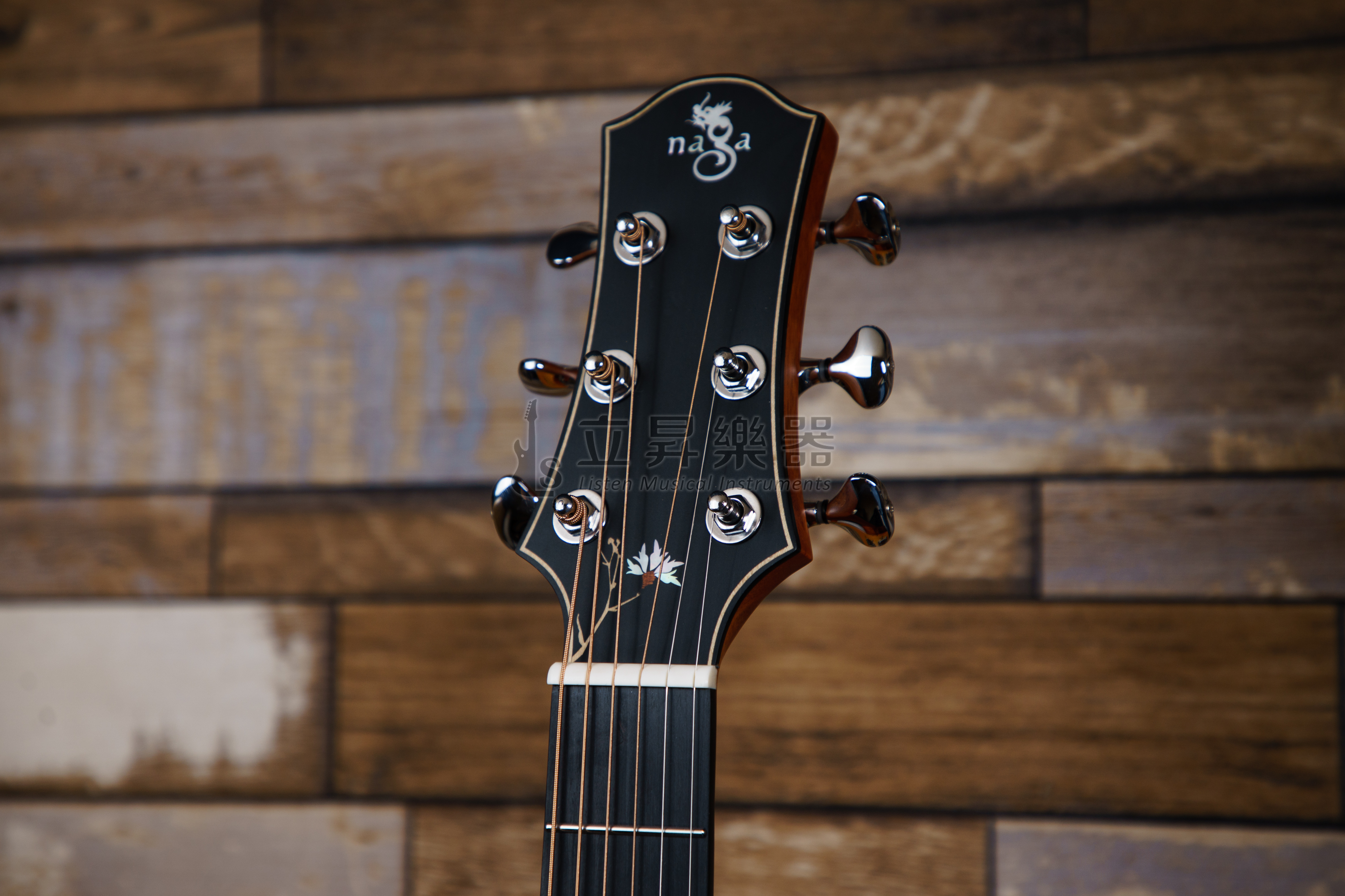全單系列的琴頭和指板上使用白貝、紅花梨、桃花芯、楓木鑲嵌了野花的圖案,靈感來源自鄭晟河吉他設計大賽冠軍選手唐毅的作品《野花》。
